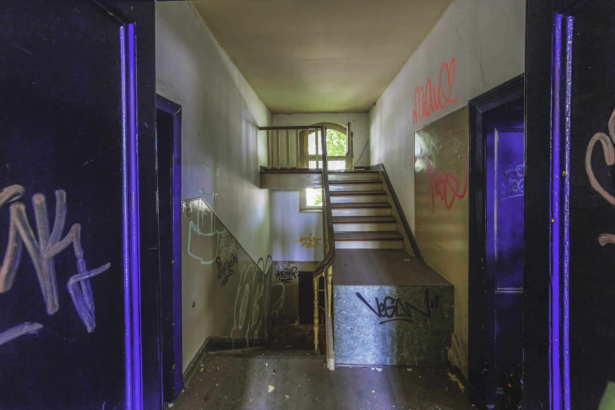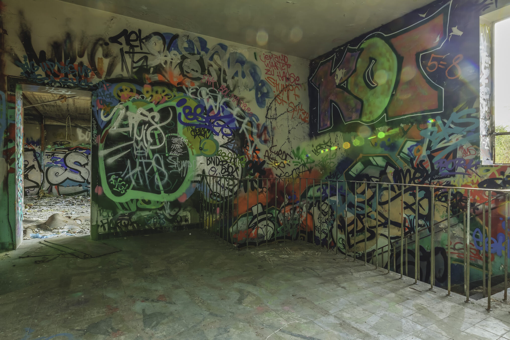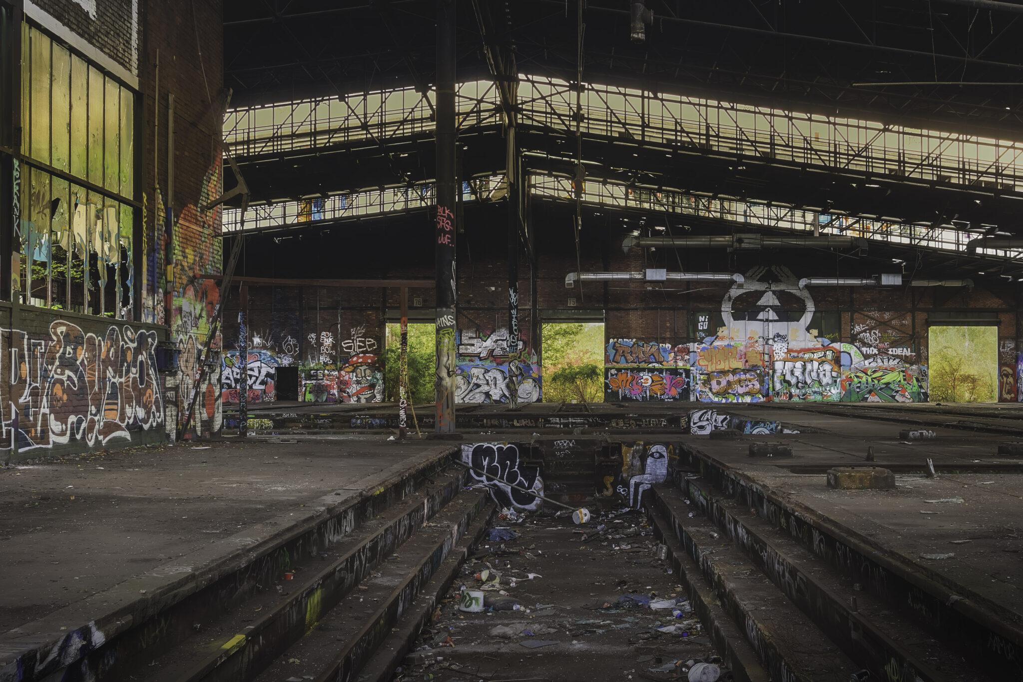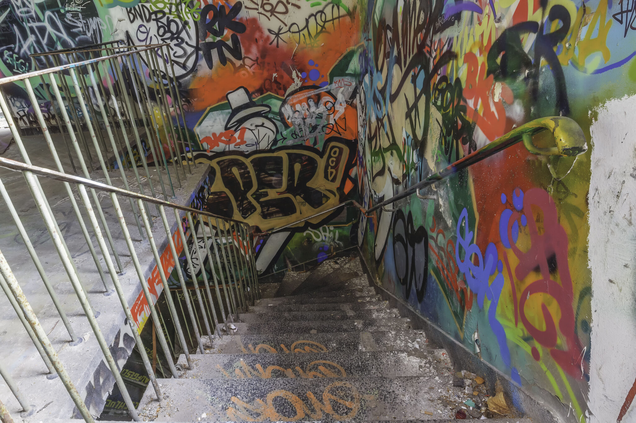 Die Hallen sind heute eine farbenfrohe Sammlung unterschiedlichster Graffiti-Kunstwerke, die die Geschichte des Ortes auf künstlerische Weise widerspiegeln. Neben abstrakten Motiven finden sich auch Darstellungen historischer Elemente der Eisenbahn und des Bahnbetriebs. Einige sind kunstvoll gestaltet, andere eher simple Schmierereien. Besonders auffällig war eine Treppe mit gelber Schrift, die eine markante Botschaft trug: “Alles, was ich hatte, geschluckt, aufgehängt, aufgeschützt. Es ist getan.” Ein bedrückendes Mahnmal oder einfach nur poetische Worte?