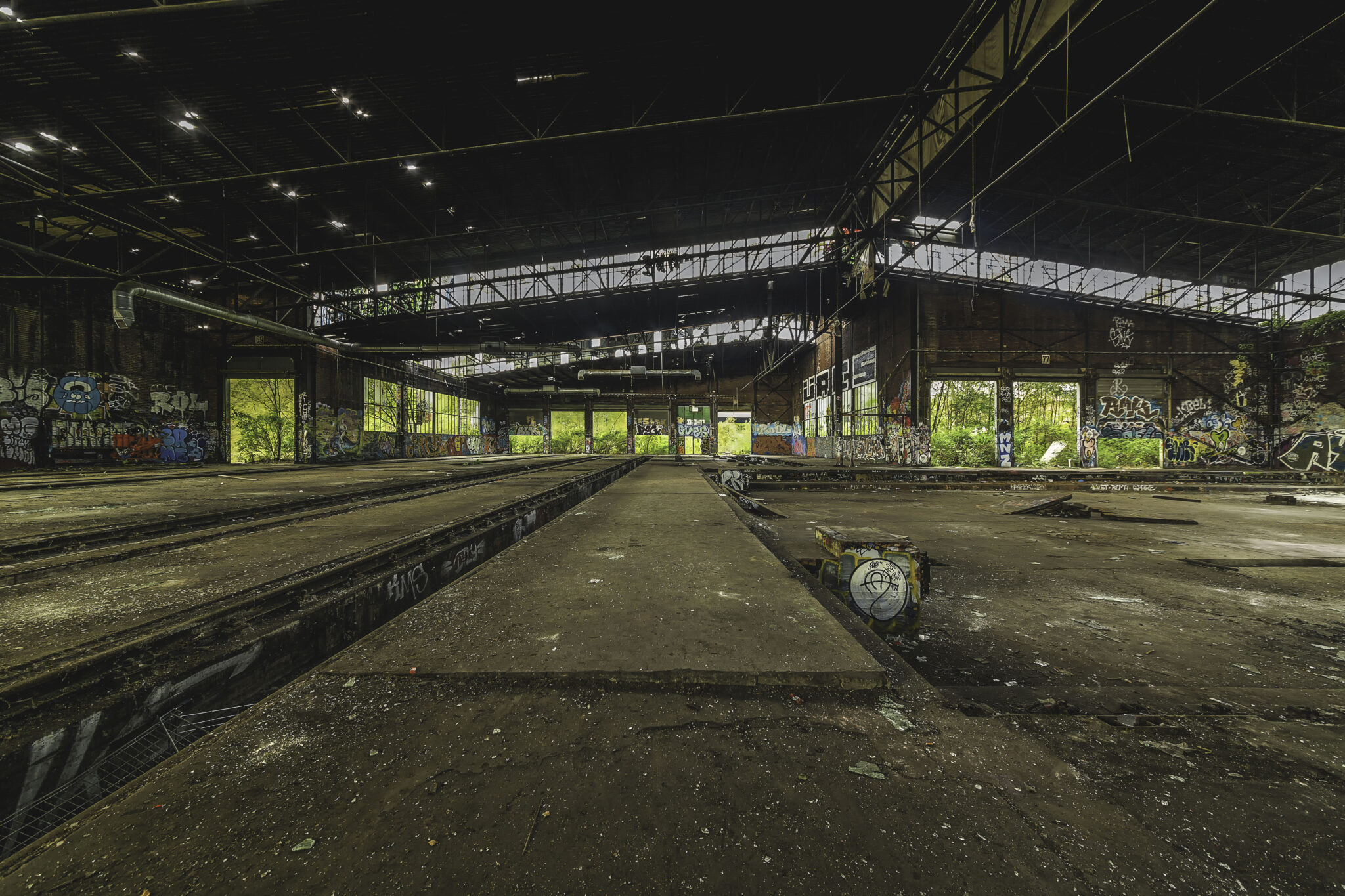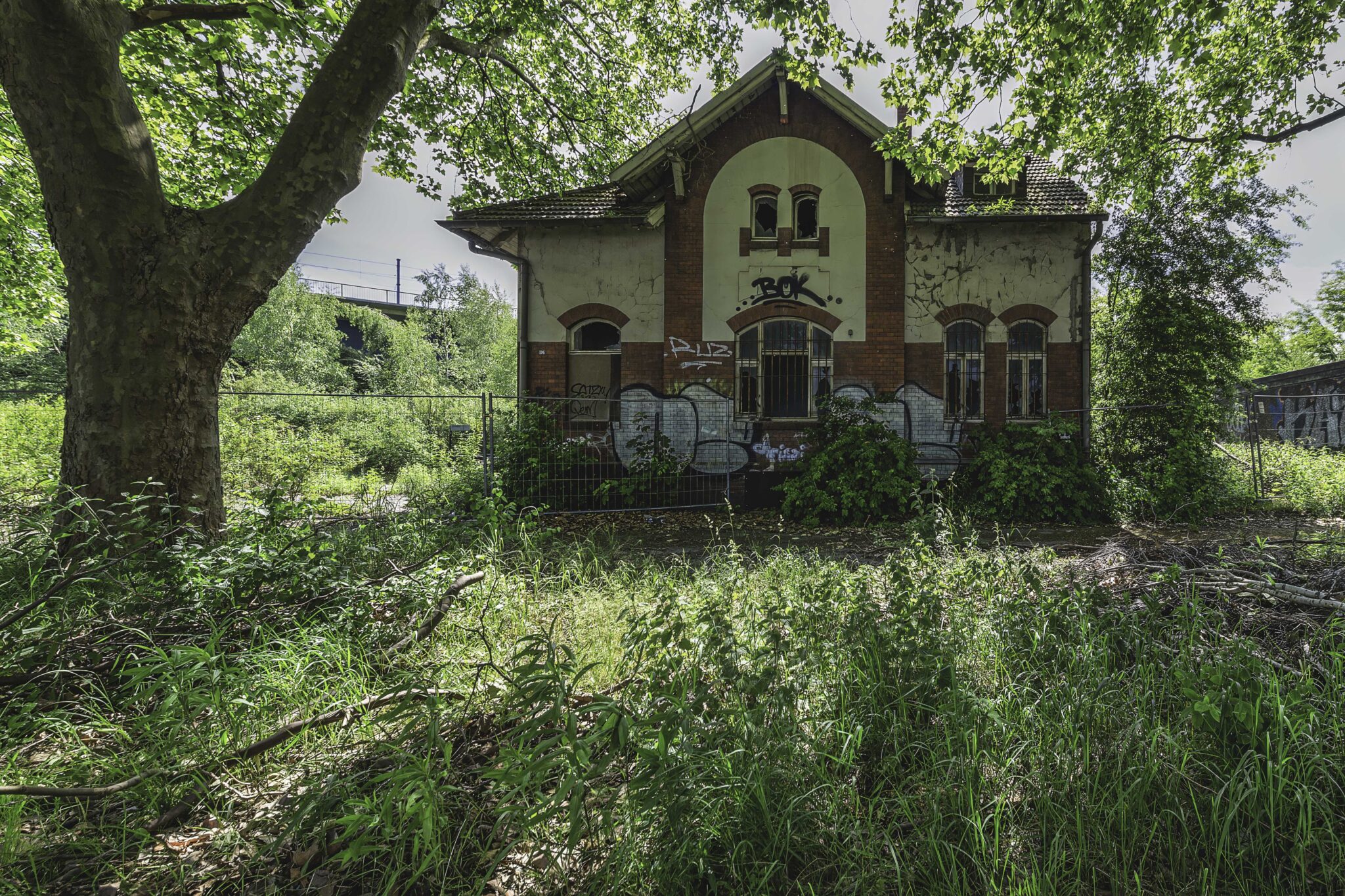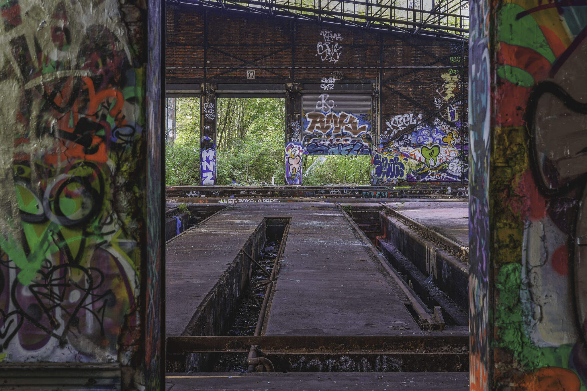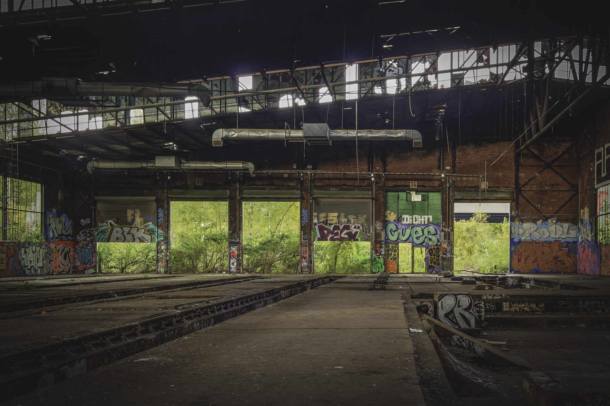 Bereits beim Betreten der Ruine wurde klar: Hier hat die Natur sich ihren Platz zurückgeholt, wie es oft bei verlassenen Industrieanlagen zu beobachten ist. Der fortschreitende Verfall zeigt eindrucksvoll, wie schnell einst belebte Orte der Vergangenheit angehören können. Die alten Bahngleise sind mit dichten Gräsern und kleinen Bäumen überwuchert, Wurzeln sprengen die Pflastersteine auf dem einst geschäftigen Betriebshof.