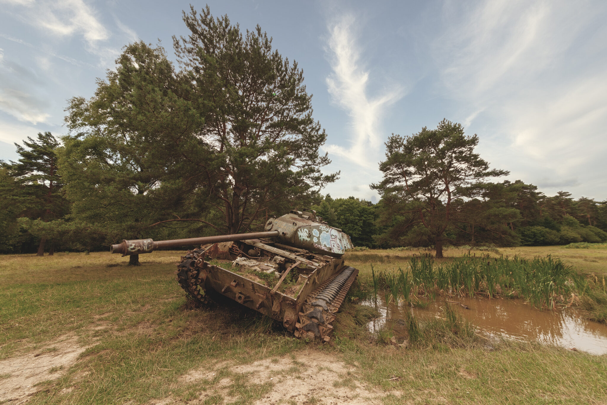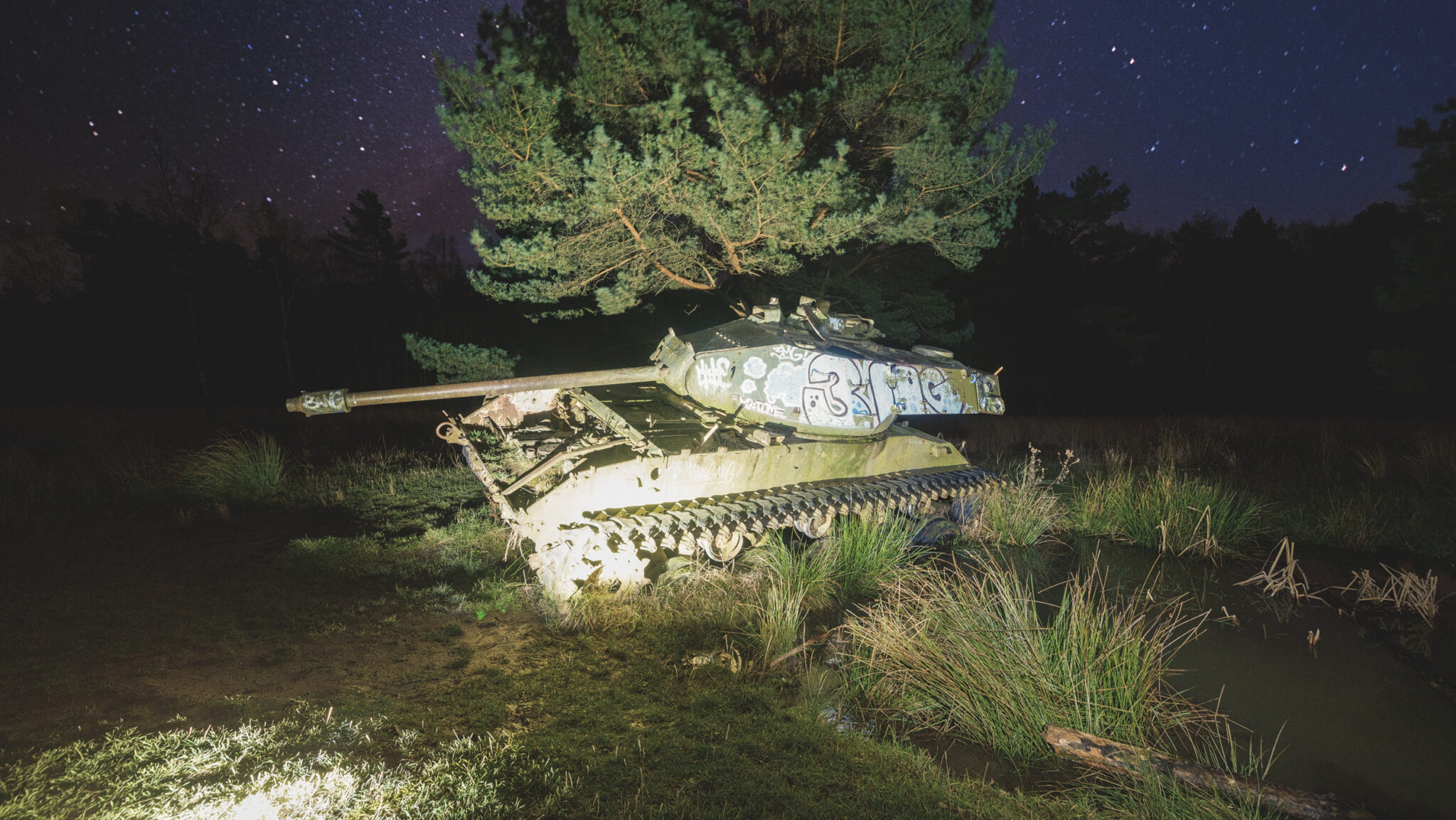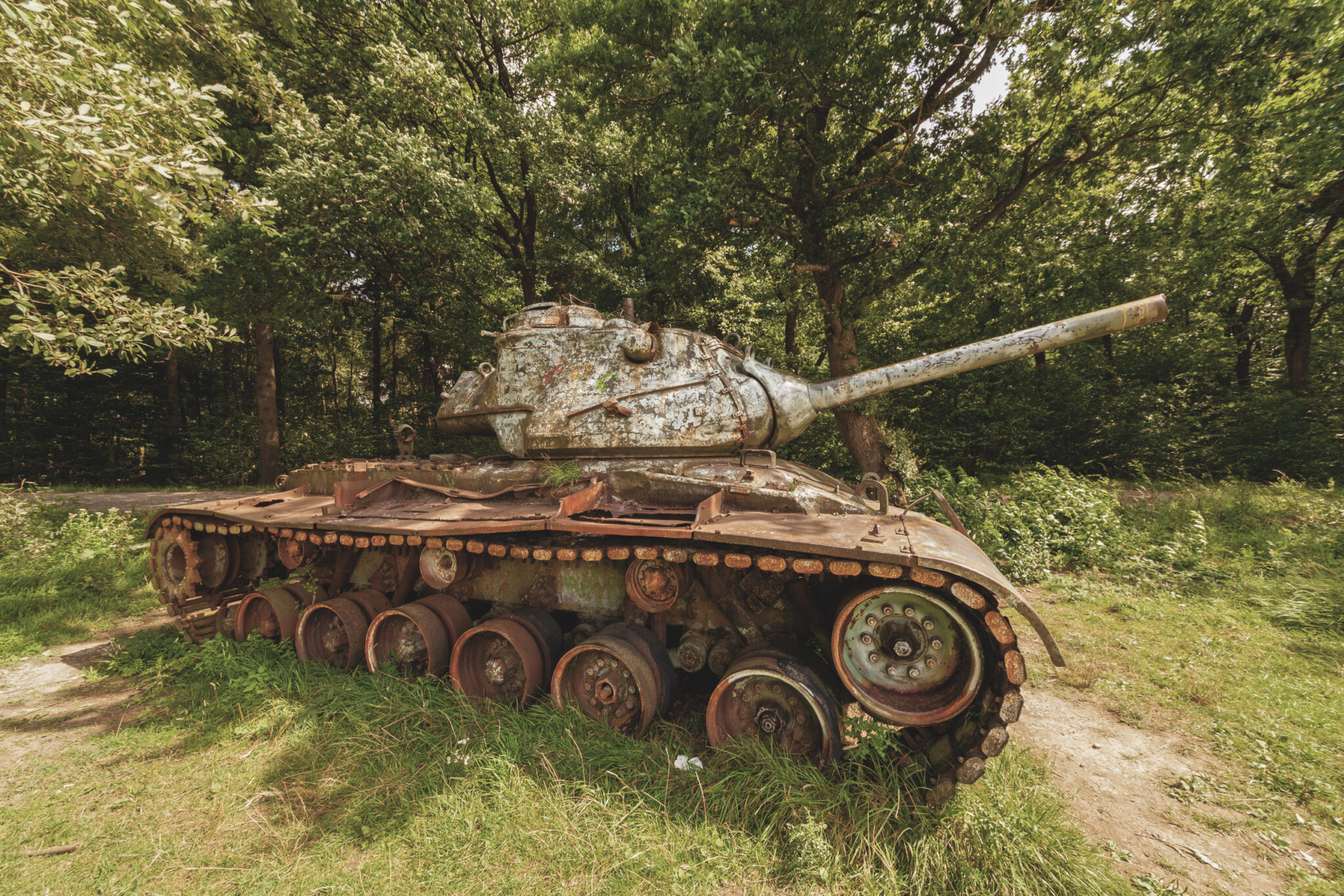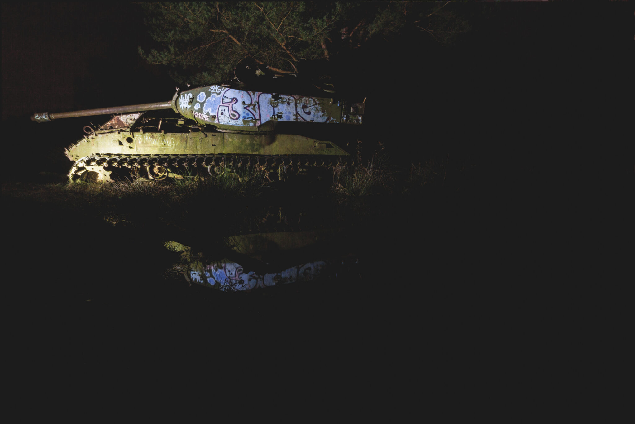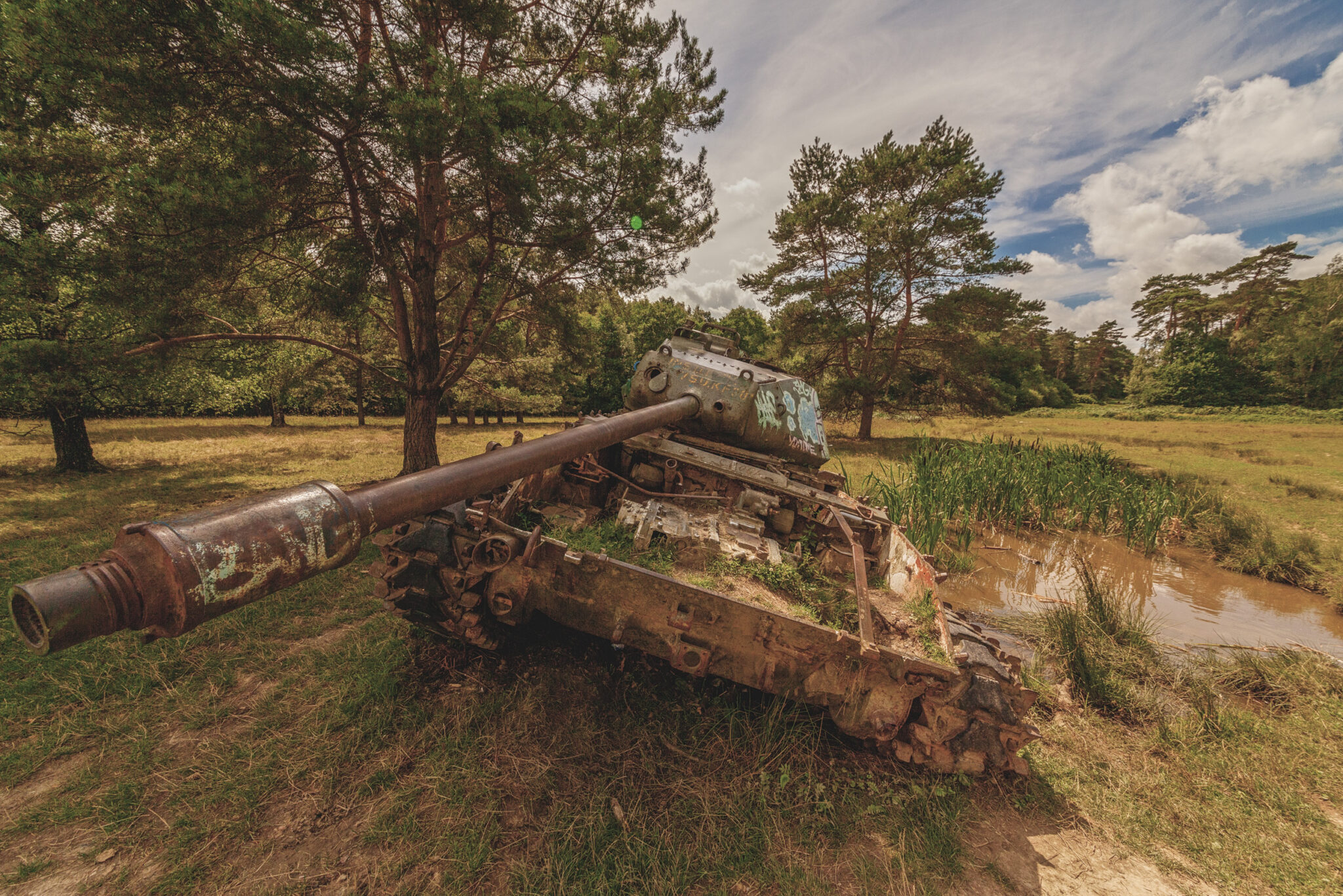 Es ist eine bizarre Szenerie: die gewaltigen Metallkolosse, überwuchert von Gras und Moos, bemalt mit dem Graffiti der Zeit, festgehalten in der Ewigkeit eines stillen Waldfriedhofs. Hier finden sich Motive, die so selten sind, dass sie fast surreal wirken. Jeder Rostfleck erzählt eine eigene Geschichte, jedes durchlöcherte Panzerblech birgt ein Geheimnis.