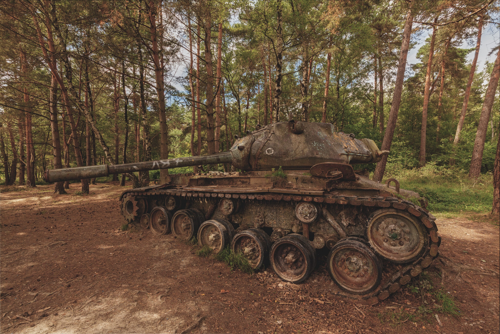 Die mächtigen Panzer – darunter ein M41 Walker Bulldog und mehrere M47 Patton – stehen noch immer Wache, obwohl ihre Kriegstage längst vorüber sind. Sie dienten lange als Hartziele, heute umhüllt sie die Stille des Waldes.