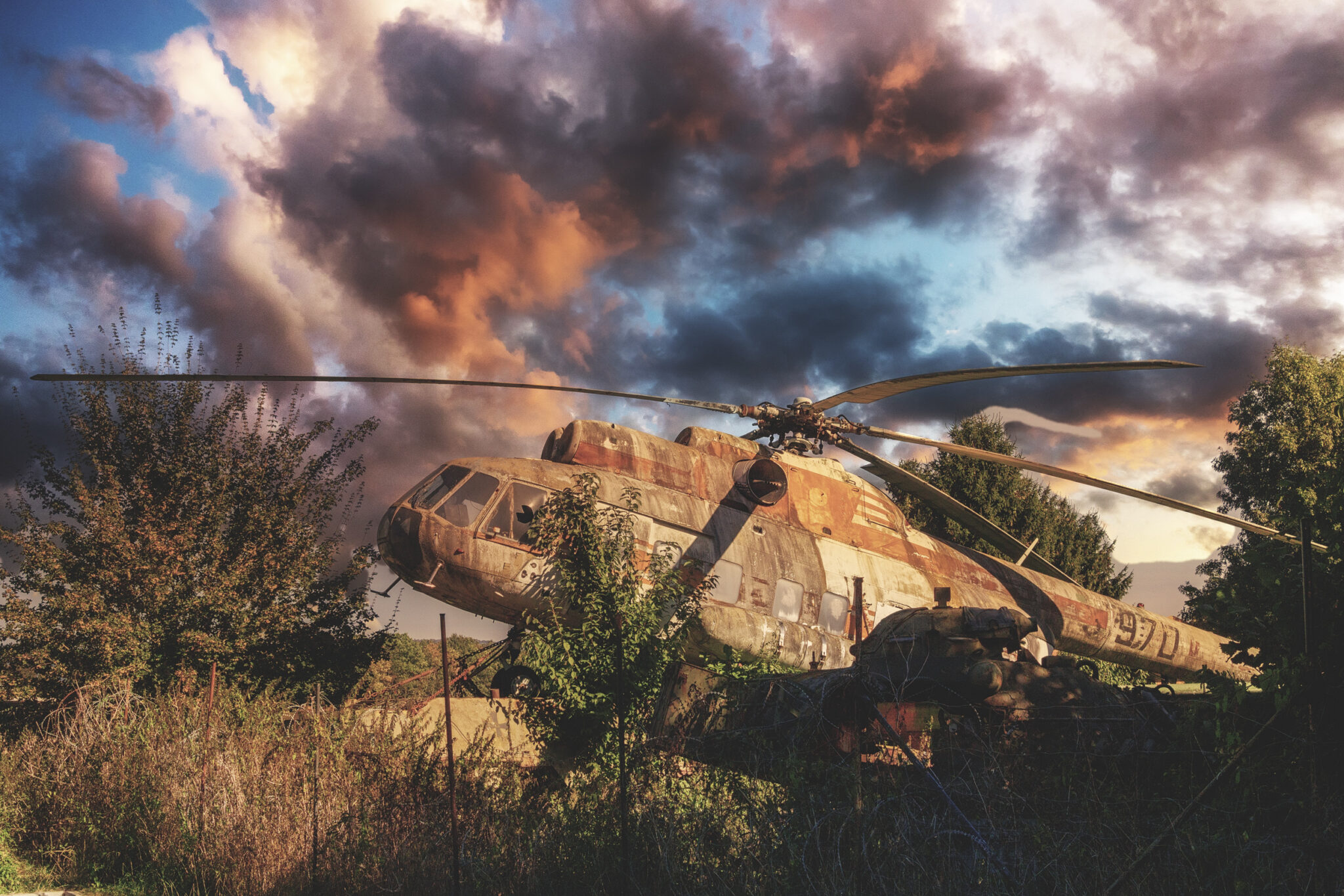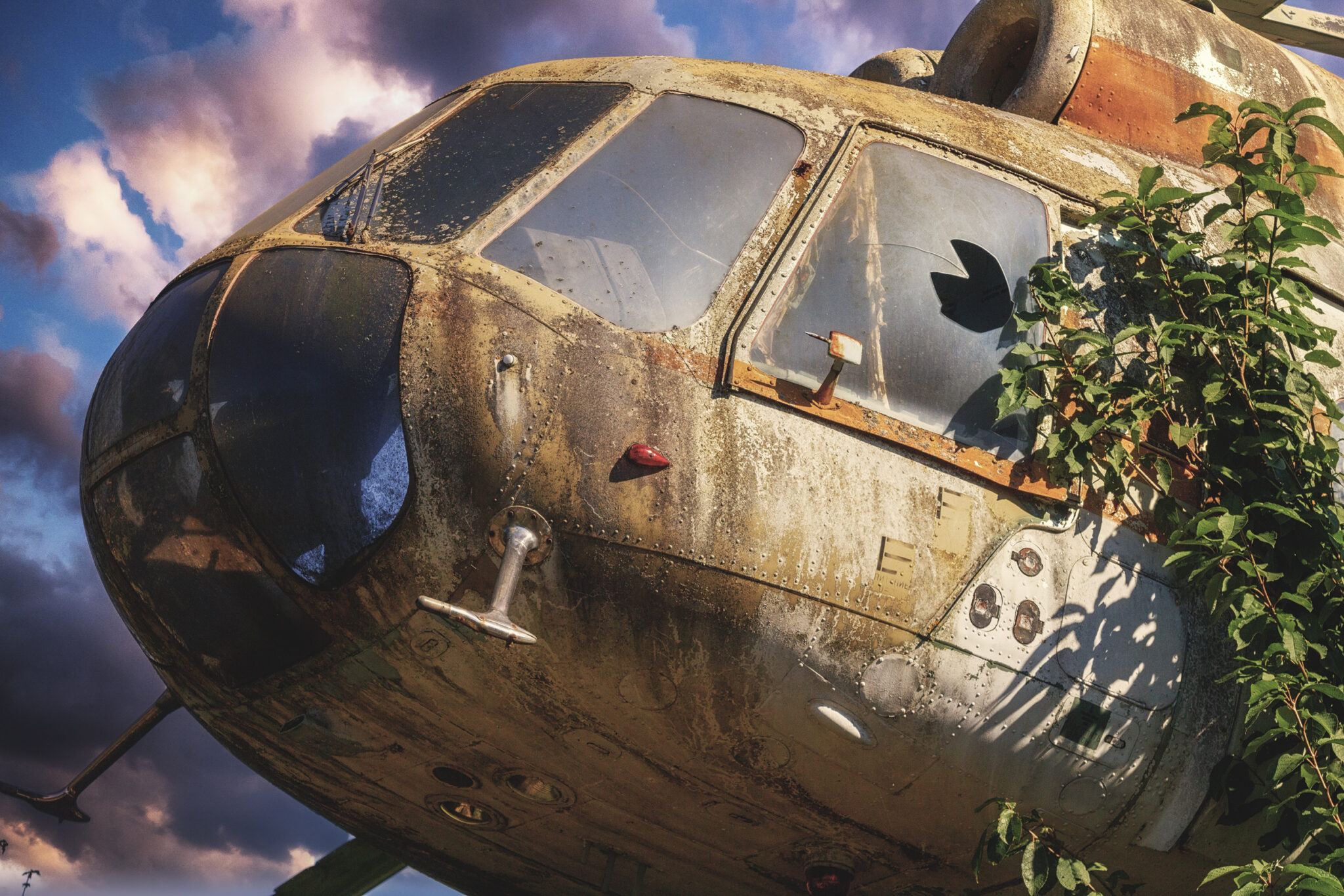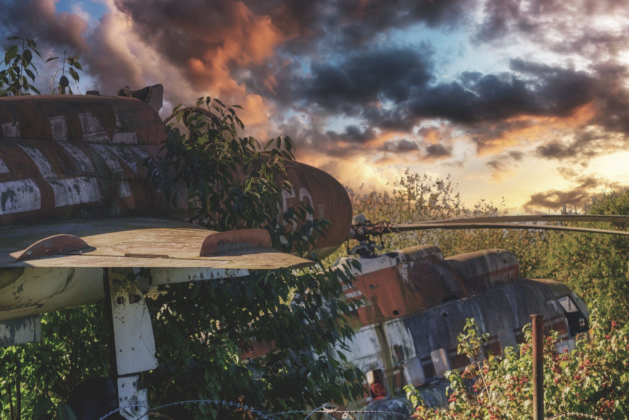 Heute steht das Gelände leer. Verwitterte Flugzeuge, Hubschrauber und Militärfahrzeuge liegen verstreut auf dem Areal, während die Natur langsam Besitz von ihnen ergreift. Efeu und Unkraut wuchern über die alten Maschinen, der Rost nagt unaufhörlich an den Metallkonstruktionen. Der Verfall ist unübersehbar – und doch ist er von einer besonderen, fast erhabenen Schönheit geprägt.