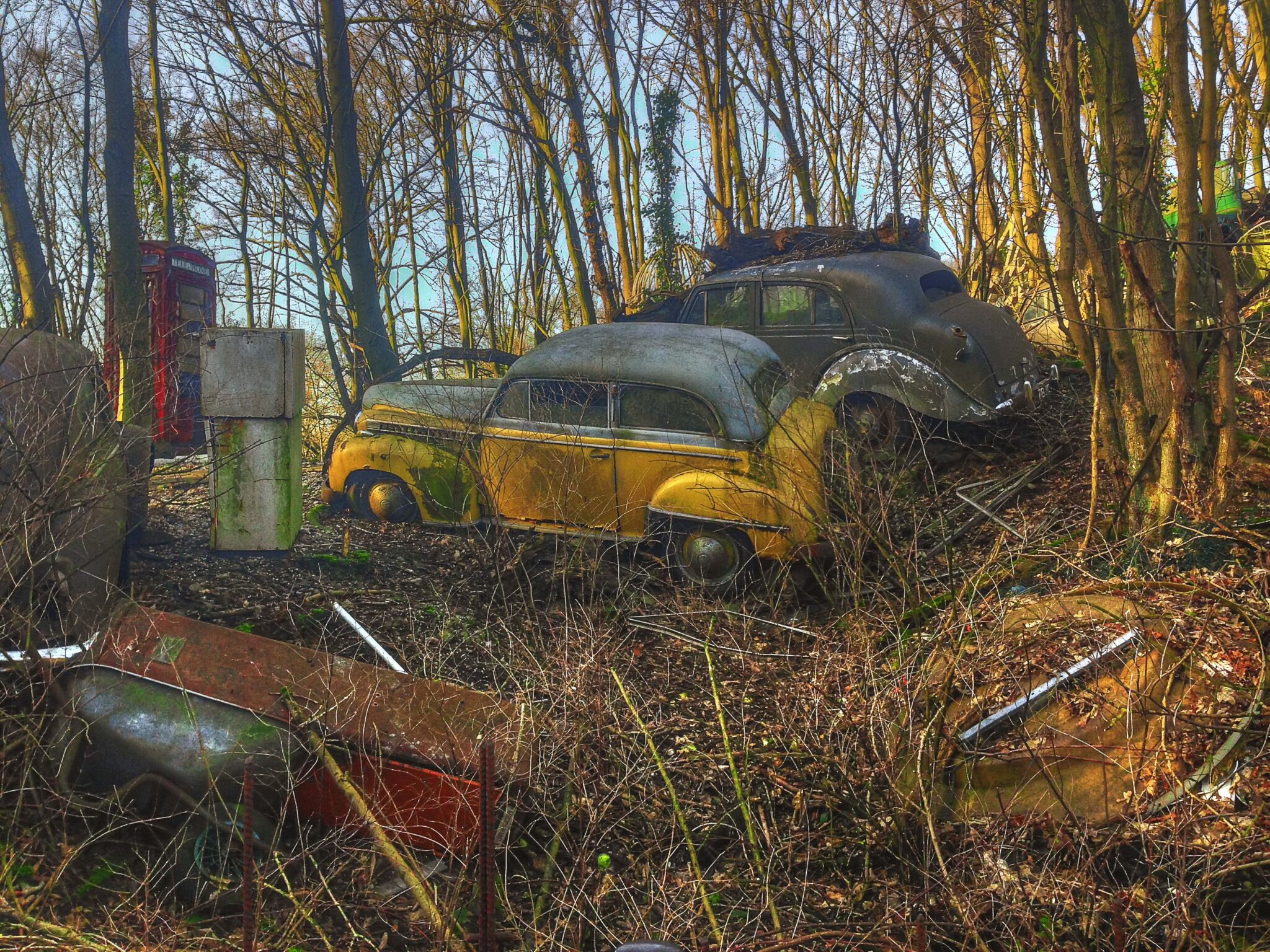 Die Fahrzeuge – darunter Raritäten wie Porsche 356, Rolls-Royce Silver Wraith, Jaguar XK 120, Mercedes, Citroën und US-Klassiker – waren 2000 noch restauriert und fahrbereit. In den folgenden Jahren wurden sie nach allen Regeln des natürlichen Verschleißes Wind, Wetter, Laub und Tieren überlassen. Damit nicht genug: Fröhlich beschleunigte teils den Zerfall mit Milch und Salzwasser, ließ Bäume durch Karosserien wachsen und verankerte so Zeitgeschichte fest im Waldboden.​