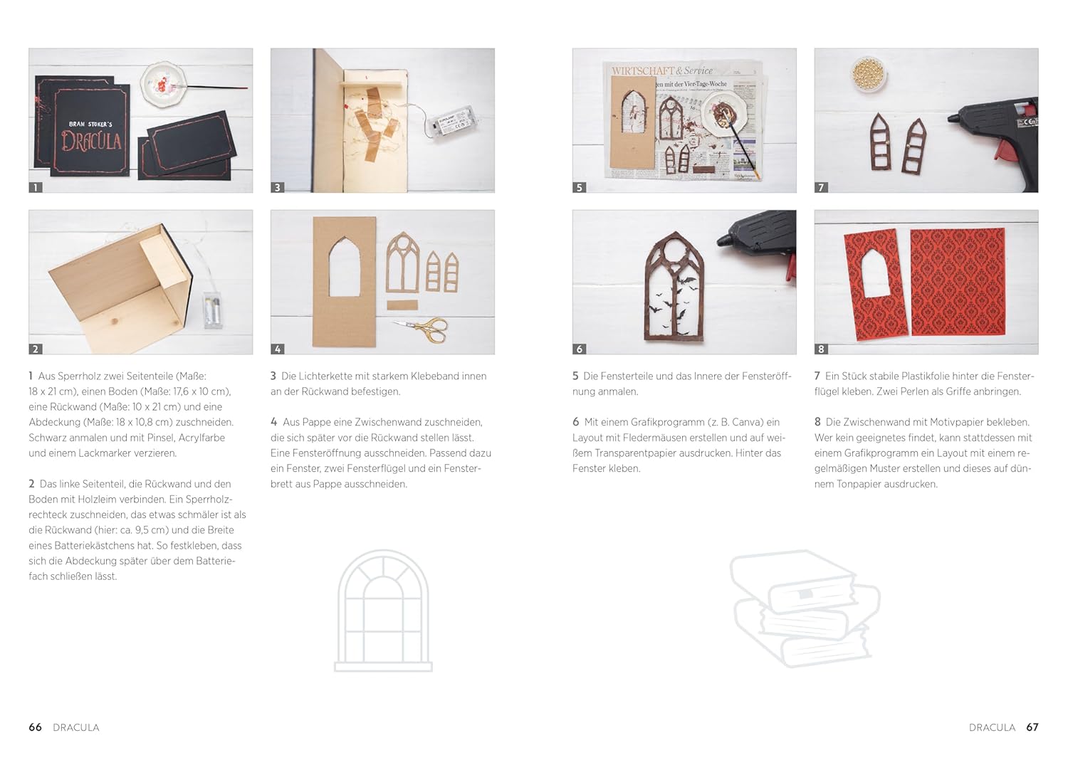 Das 144-seitige Buch liefert zehn vollwertige Projekte für Book Nooks, also Miniaturwelten, die man ins Bücherregal zwischen zwei Buchrücken einbaut. Dabei reichen die Themen von klassischen Literaturwelten bis hin zu Fantasystädten oder detailverliebten Straßenzügen.