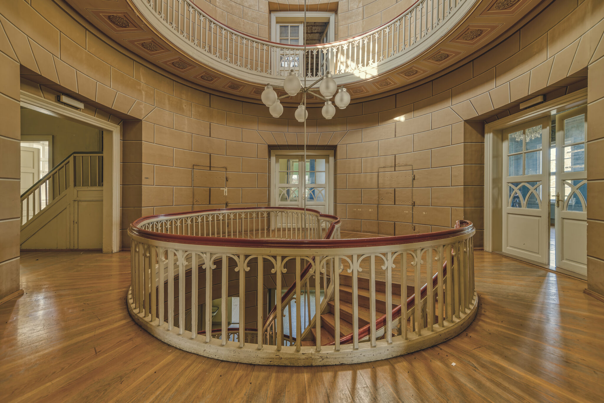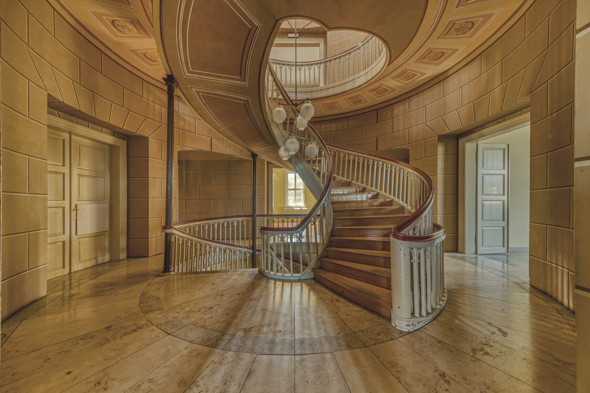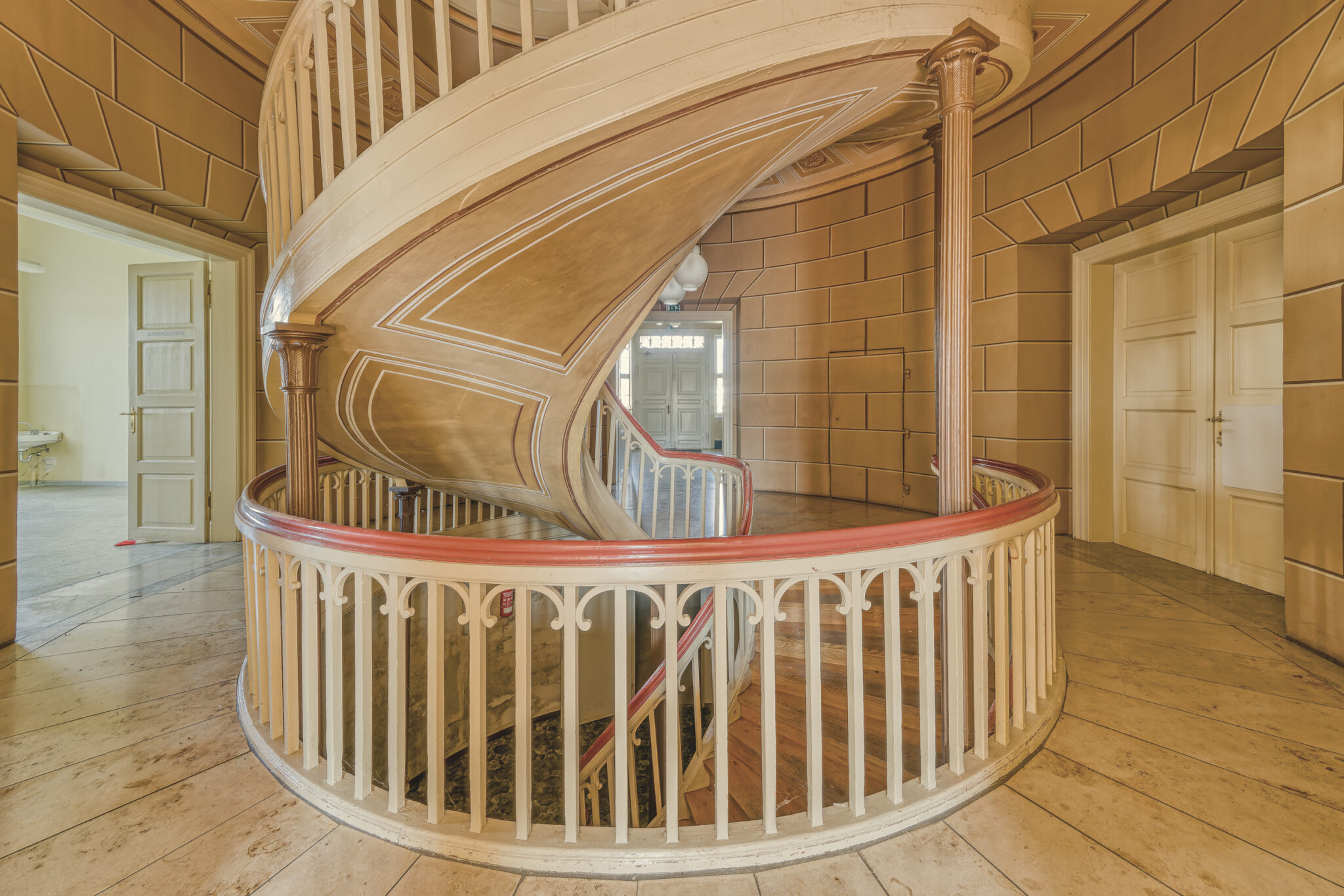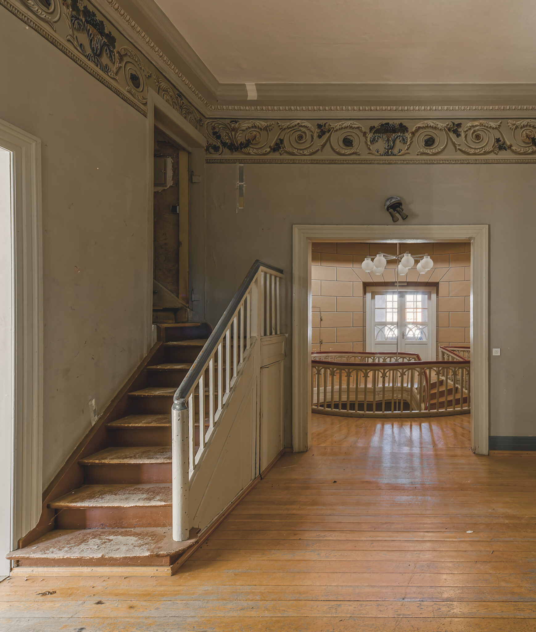 Was sofort auffällt, ist die erhabene Eleganz der Architektur. Die Treppenhäuser, mit ihrer spiralförmigen Anmut, erinnern an eine vergangene Ära, in der Handwerkskunst und Ästhetik Hand in Hand gingen. Die prachtvollen Räume, einst gefüllt mit Gesprächen, Lachen und Musik, warten nun darauf, wieder mit Leben gefüllt zu werden.