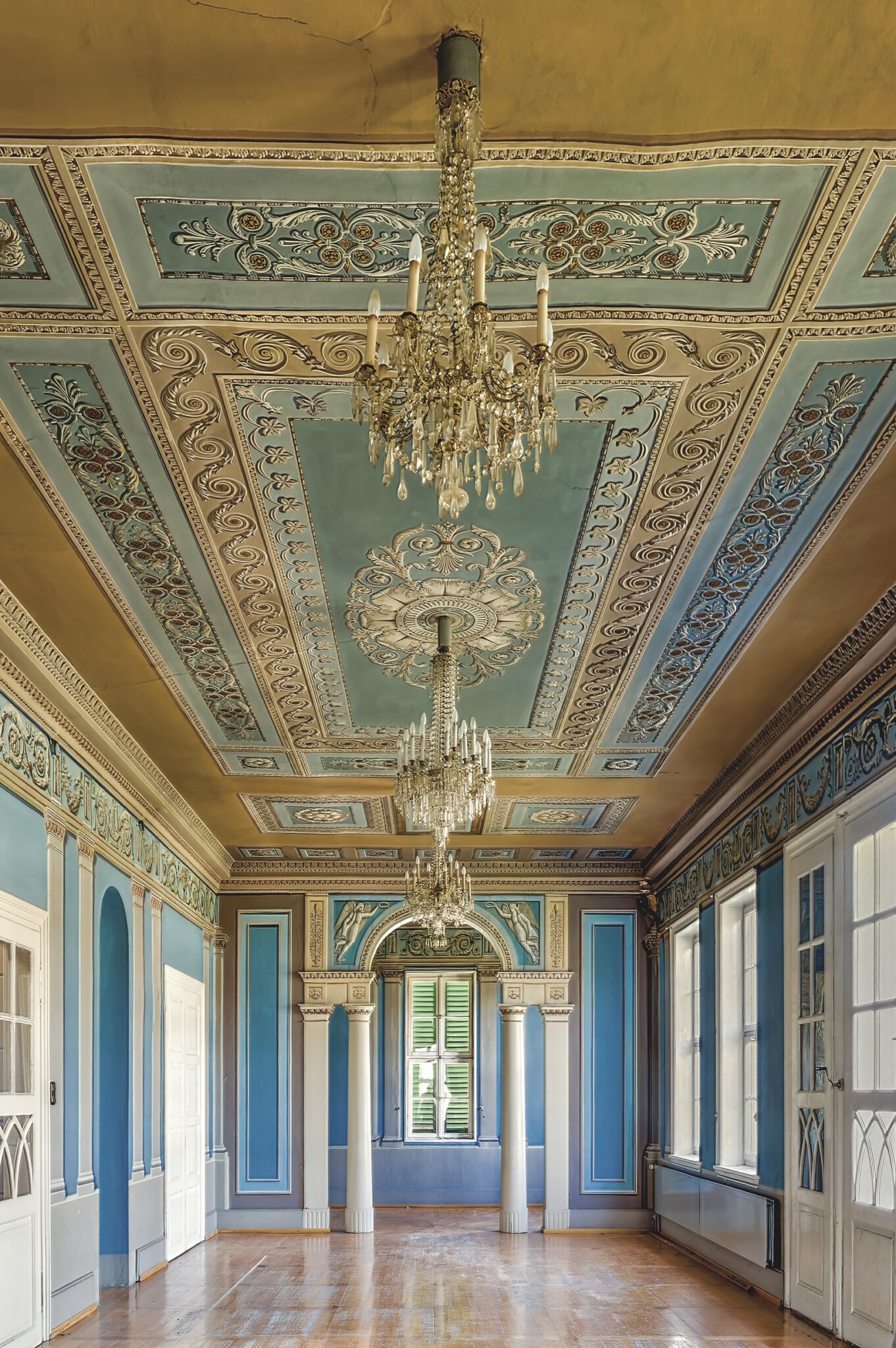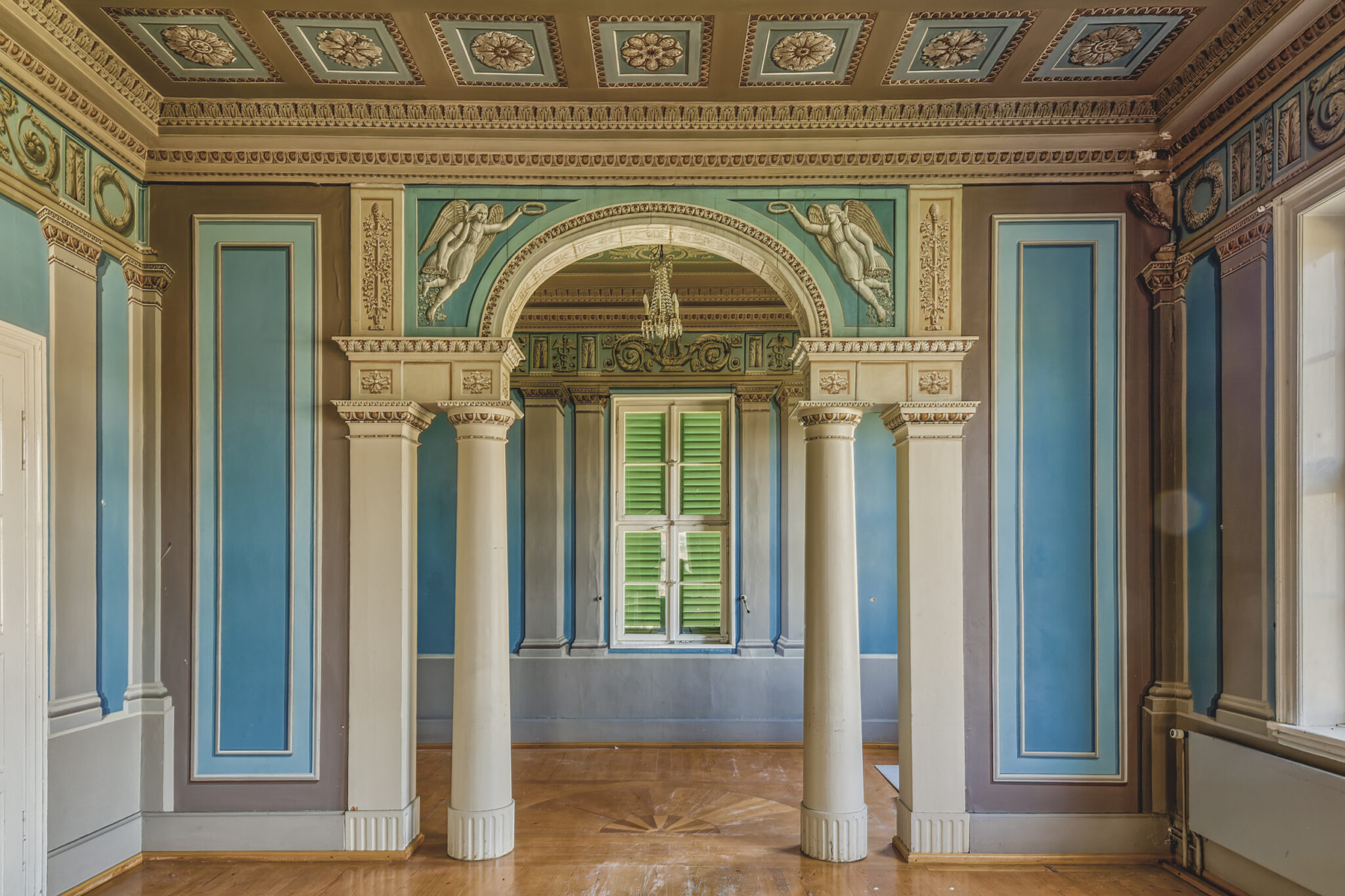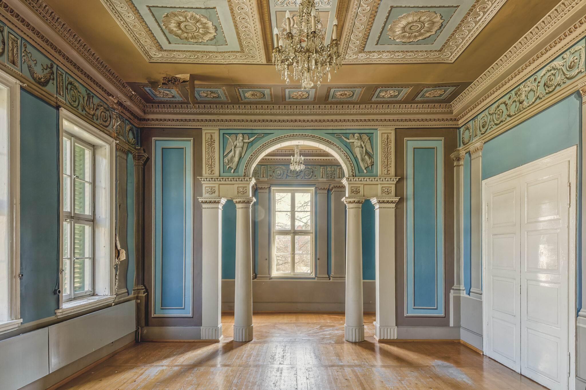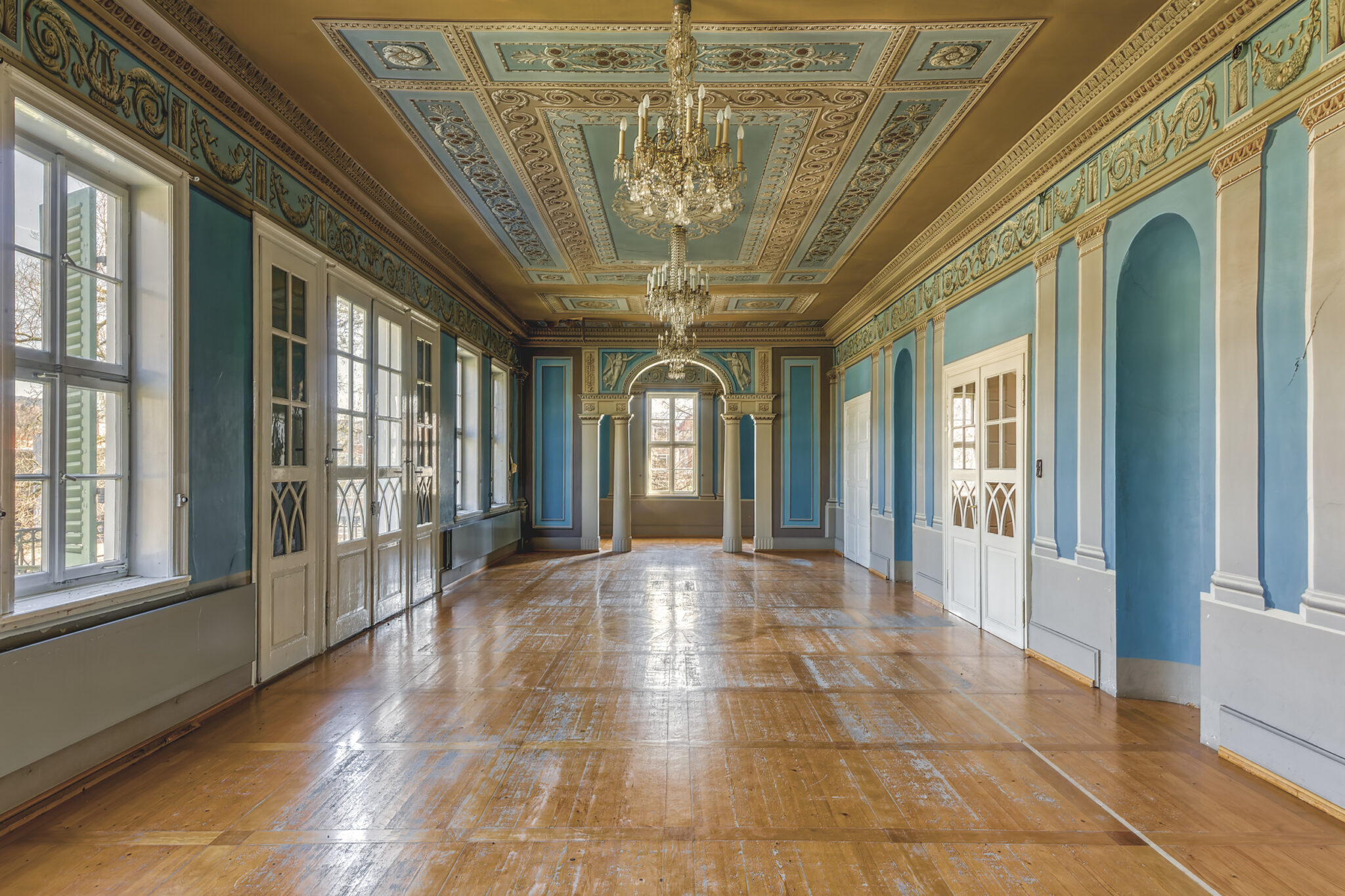 Was sofort auffällt, ist die erhabene Eleganz der Architektur. Die Treppenhäuser, mit ihrer spiralförmigen Anmut, erinnern an eine vergangene Ära, in der Handwerkskunst und Ästhetik Hand in Hand gingen. Die prachtvollen Räume, einst gefüllt mit Gesprächen, Lachen und Musik, warten nun darauf, wieder mit Leben gefüllt zu werden.