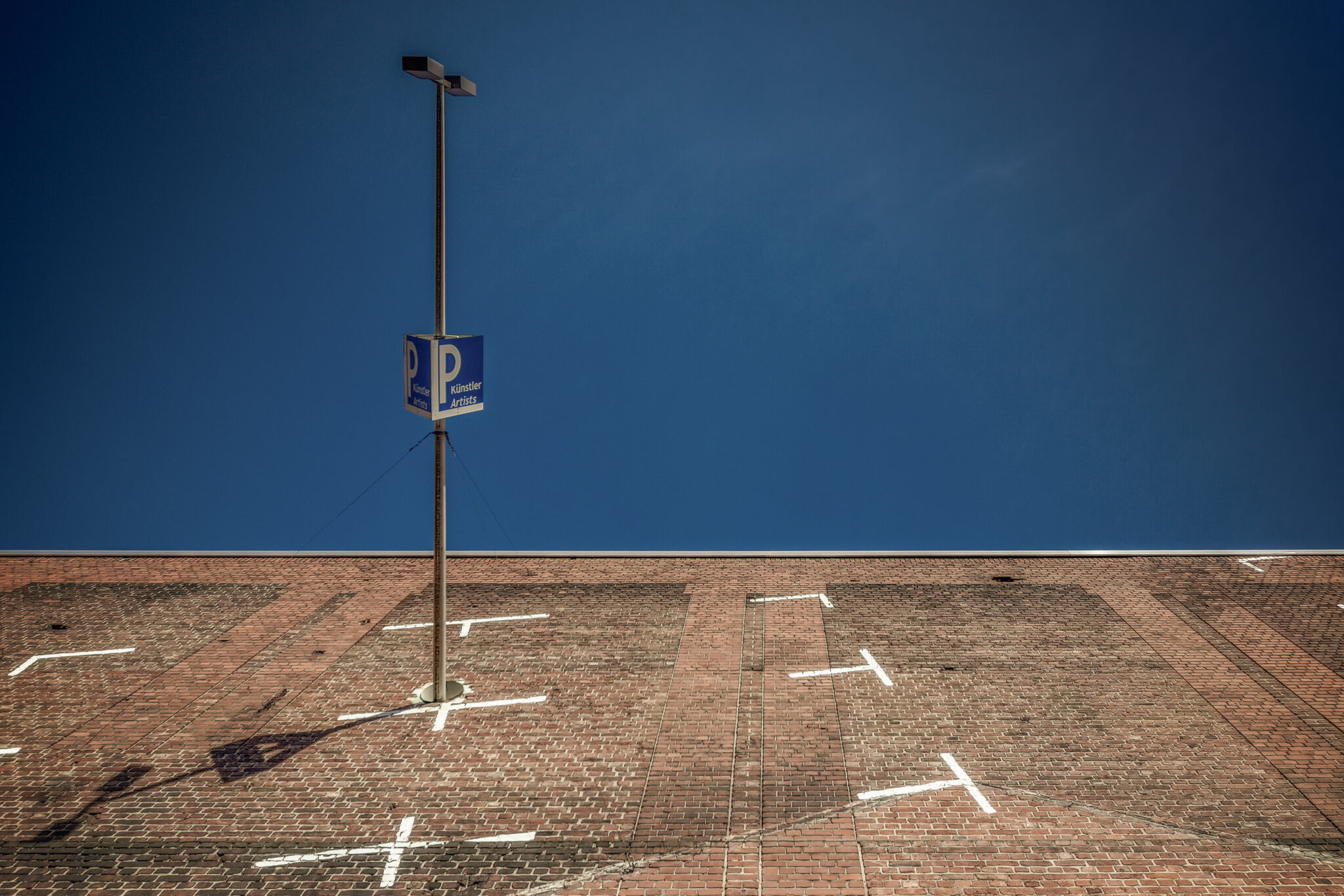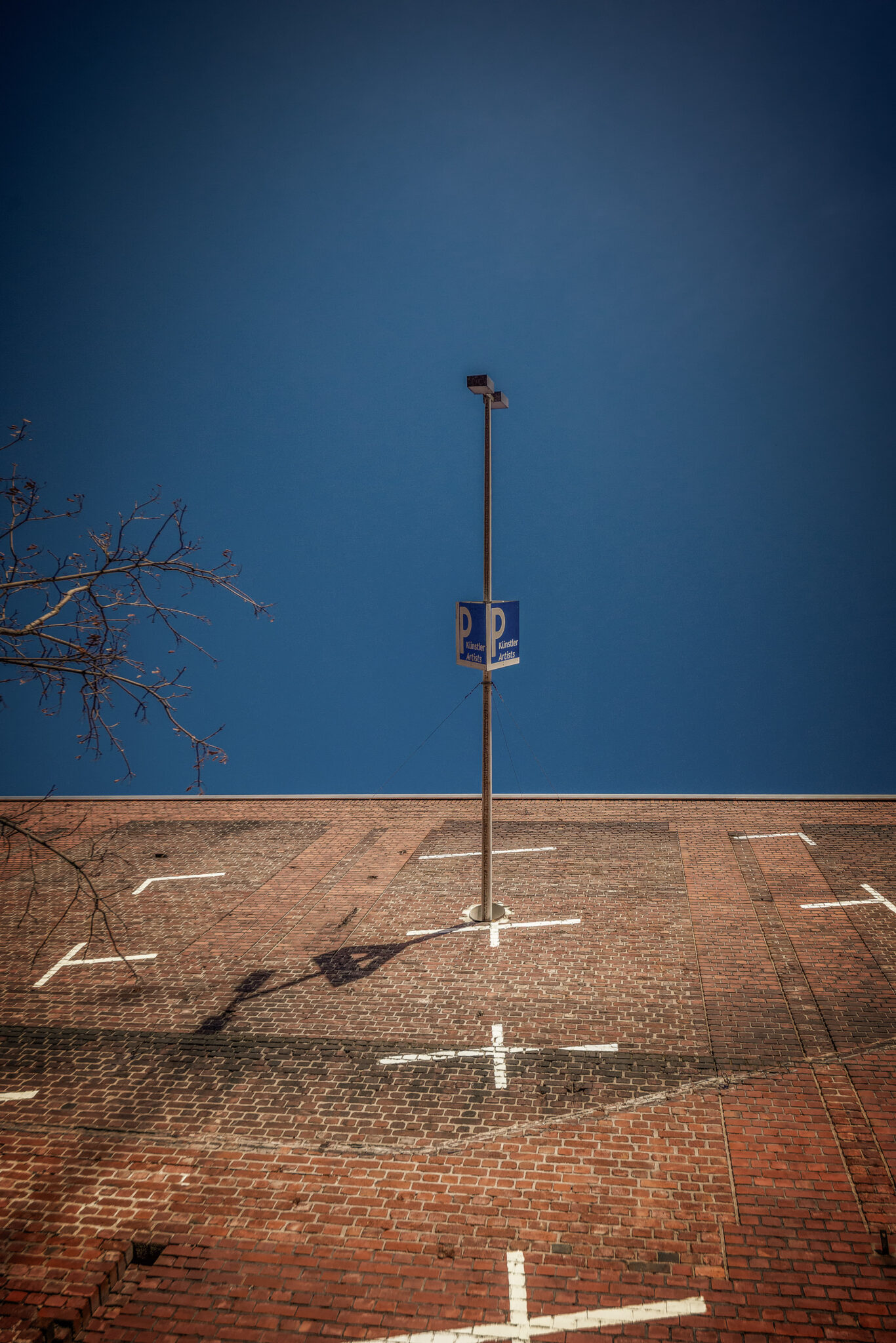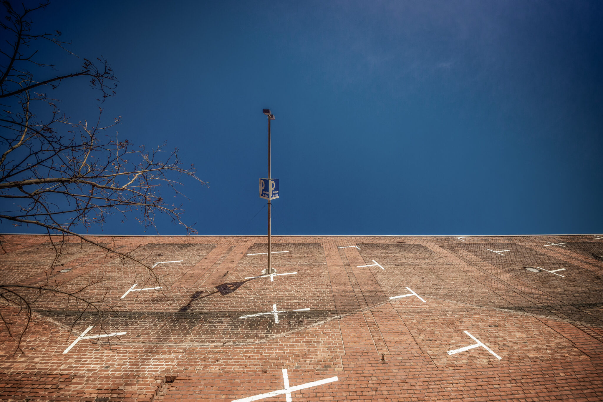 Das Besondere an diesem Platz war nicht der Parkplatz selbst, sondern das, was dahinter lag: eine Backsteinwand, deren rötliche Farbe unter dem klaren Himmel intensiv wirkte. Über sie zogen sich weiße Parkplatzmarkierungen wie ein surreales Kunstwerk – geometrisch präzise, absurd schön. Vertikale Parkplätze, auf denen niemals ein Auto stehen würde.