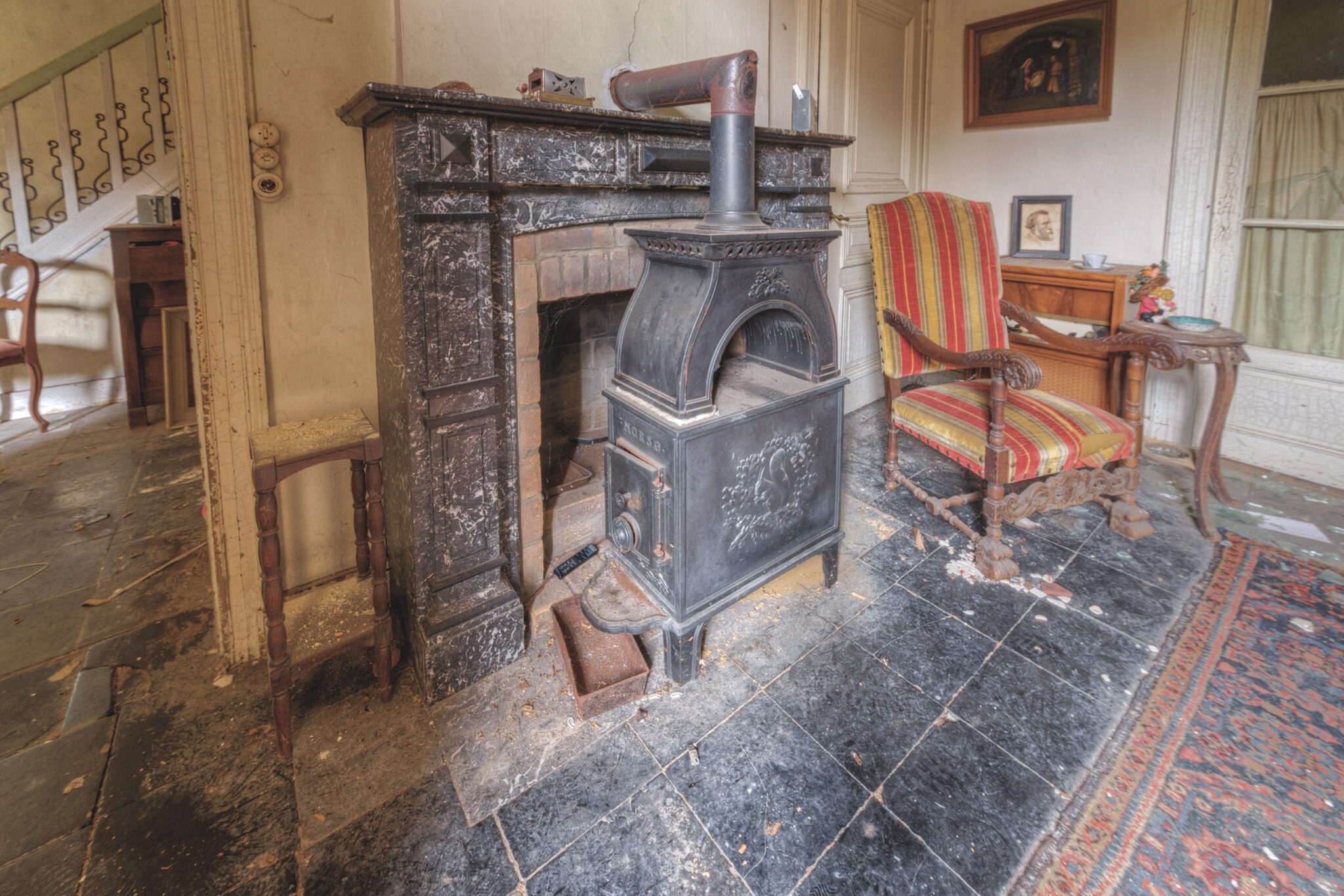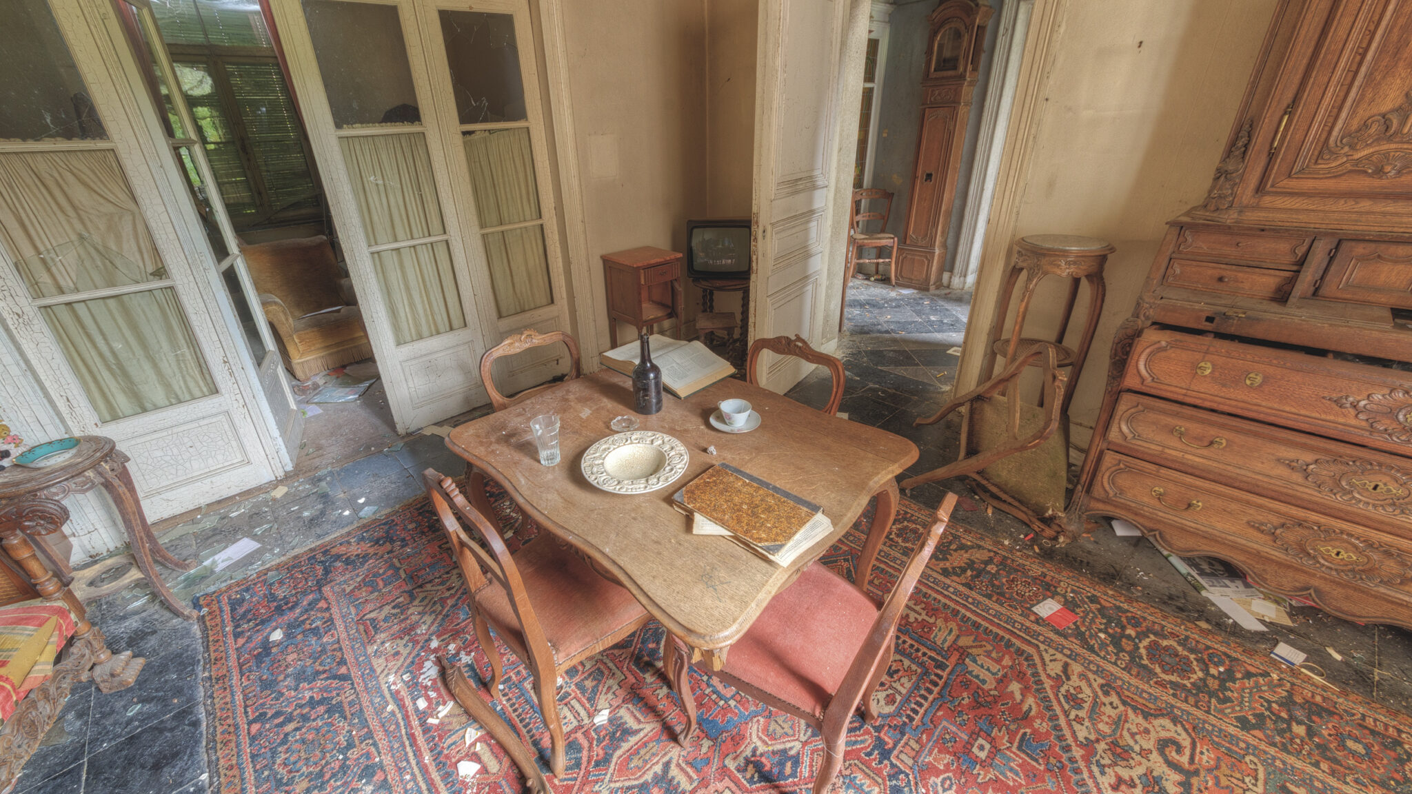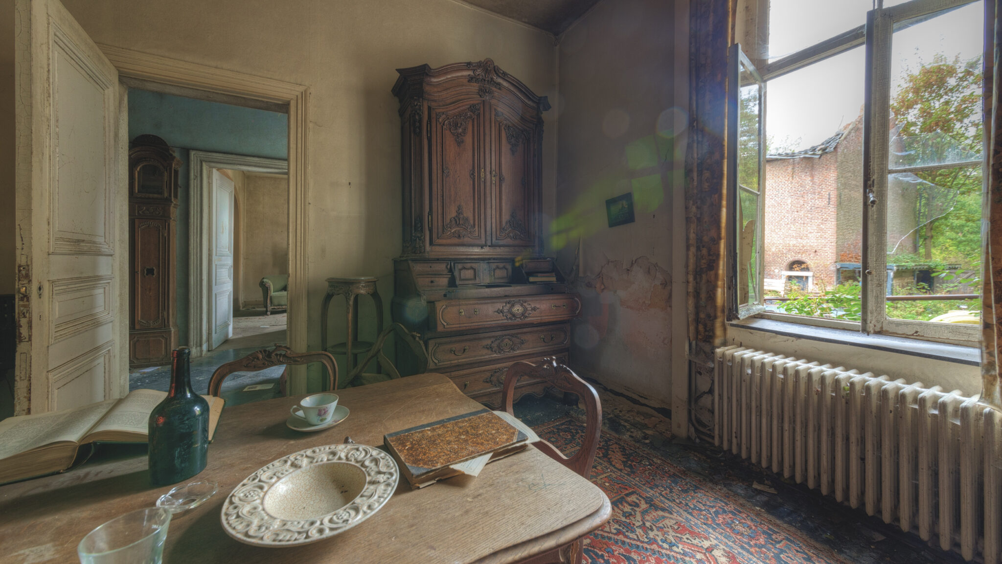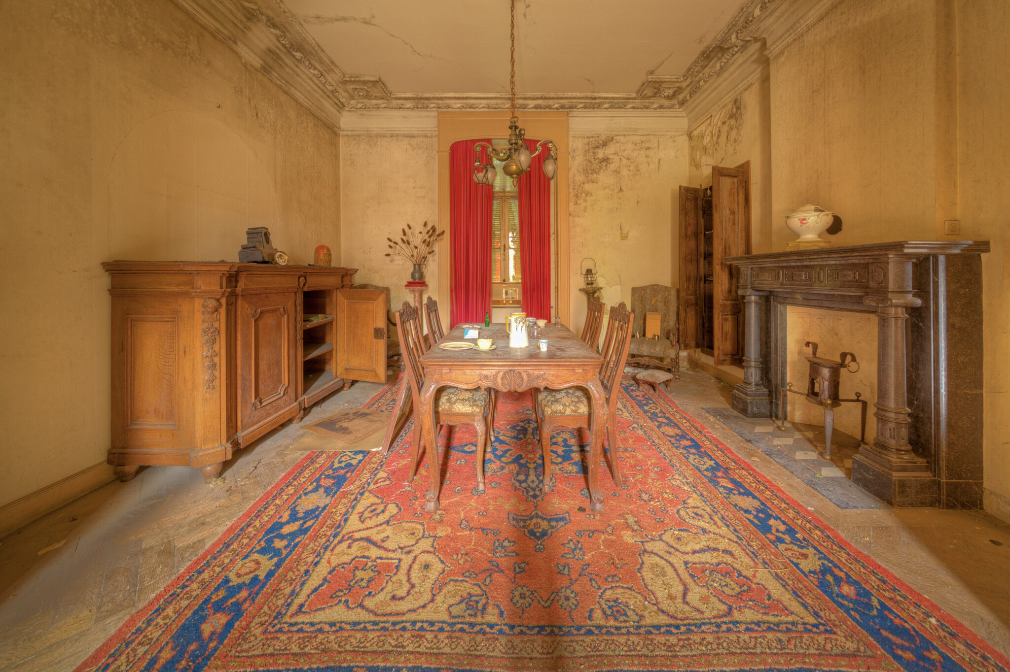 Besonders beeindruckend war das Speisezimmer, das fast wie aus einer anderen Zeit wirkte. Ein schwerer, dunkler Esstisch stand in der Mitte, umgeben von Stühlen, auf denen sich ebenfalls der Staub der Jahre gesammelt hatte. Die roten Vorhänge, die einst wohl stolze Gastgeber von neugierigen Blicken abschirmten, hingen schlaff an den Fenstern. Doch das Highlight dieses Raumes war zweifellos der prunkvolle Kamin, der dem Raum trotz des Verfalls eine gewisse Wärme verlieh.