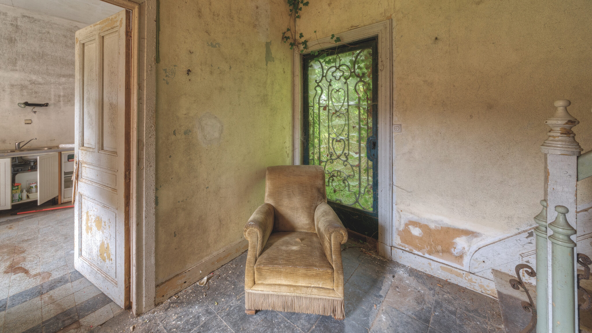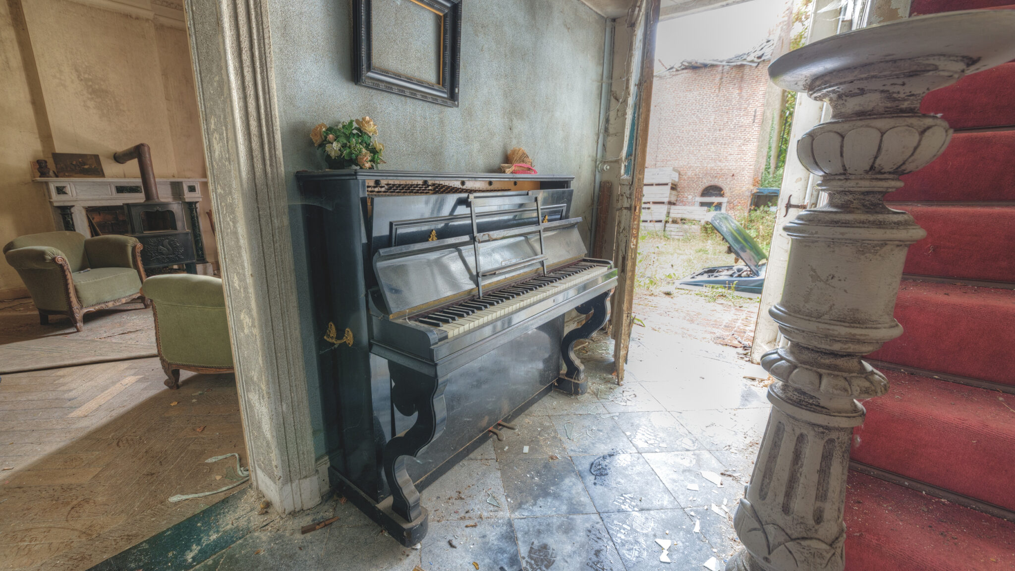 Im Inneren empfing mich eine Szenerie, die zugleich verlassen und doch lebendig wirkte. Ein altes Klavier stand im Eingangsbereich, der Deckel leicht geöffnet, als ob die Tasten nur darauf warteten, wieder bespielt zu werden. Der Raum war von einem feinen Staubfilm bedeckt, und doch schien alles so, als hätte die Familie das Haus nur kurz verlassen, um bald zurückzukehren. Die Möbel waren noch da, die Bücher lagen aufgeschlagen auf dem Tisch, und in einer Ecke des Raumes standen zwei Sessel, die zur nächsten Plauderstunde einluden.
