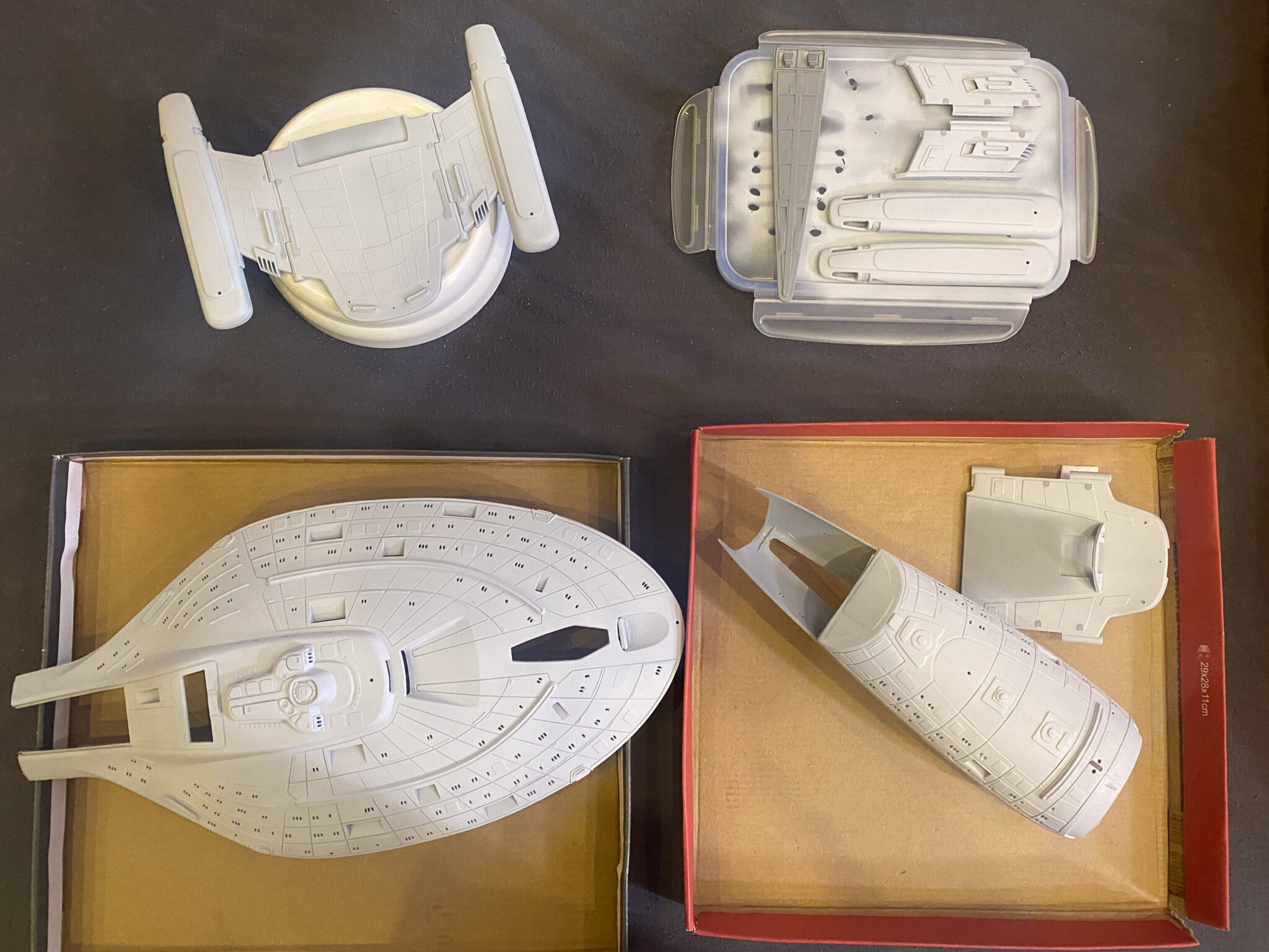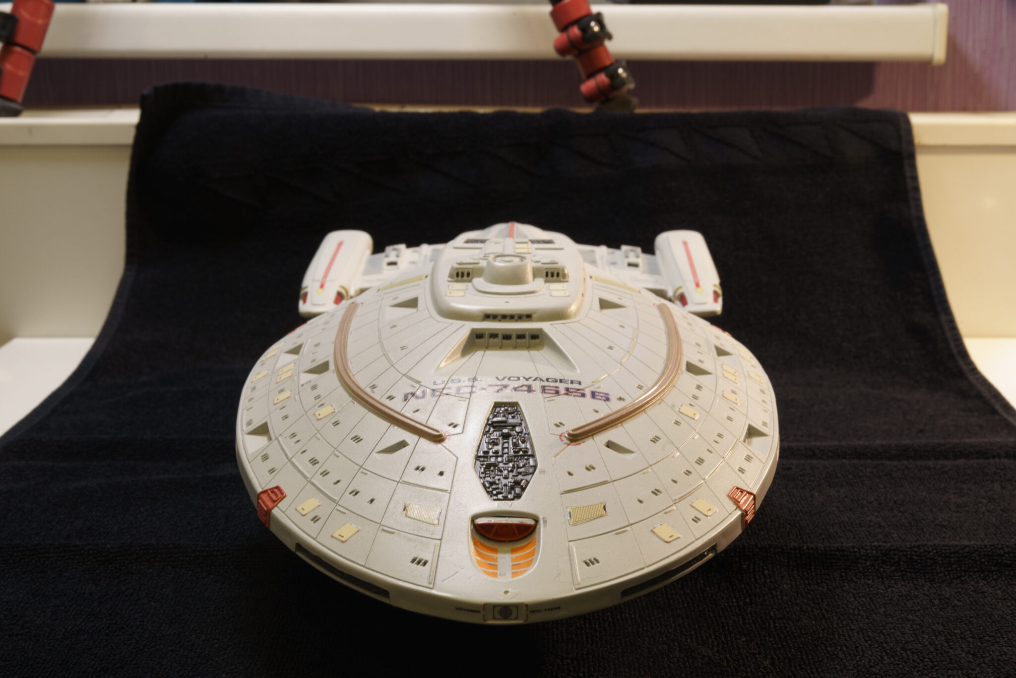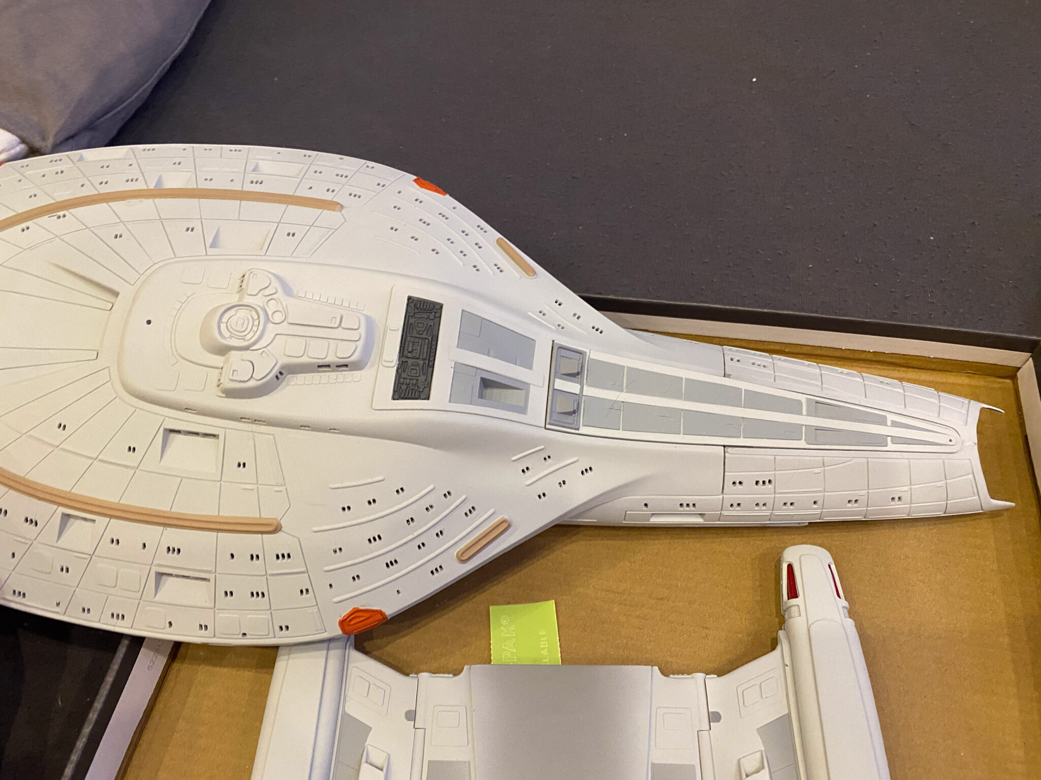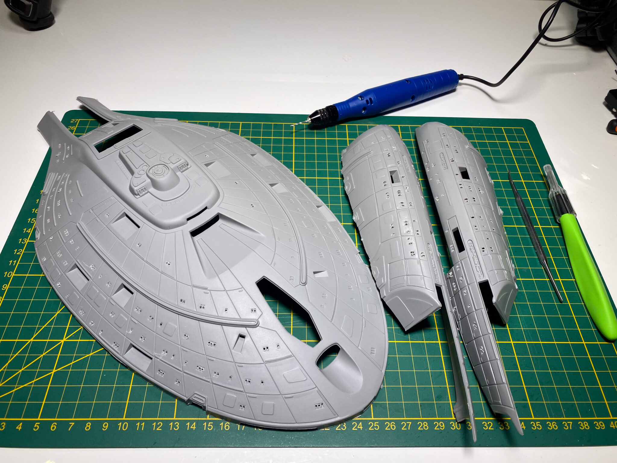 Wie bei vielen Modellbausätzen von Revell, gab es auch bei der U.S.S. Voyager einige Passungenauigkeiten. Insbesondere bei den schwenkbaren Pylonen und den Warpgondeln war ein hohes Maß an Präzision und Geduld erforderlich, um die Teile sauber zusammenzufügen. Hier halfen mir meine Erfahrung und ein wenig Kreativität: Mit Spachtelmasse und Schleifpapier konnte ich die Übergänge glätten und für eine nahtlose Optik sorgen. Diese Arbeitsschritte waren zwar zeitaufwendig, aber sie trugen wesentlich zum finalen Erscheinungsbild des Modells bei.