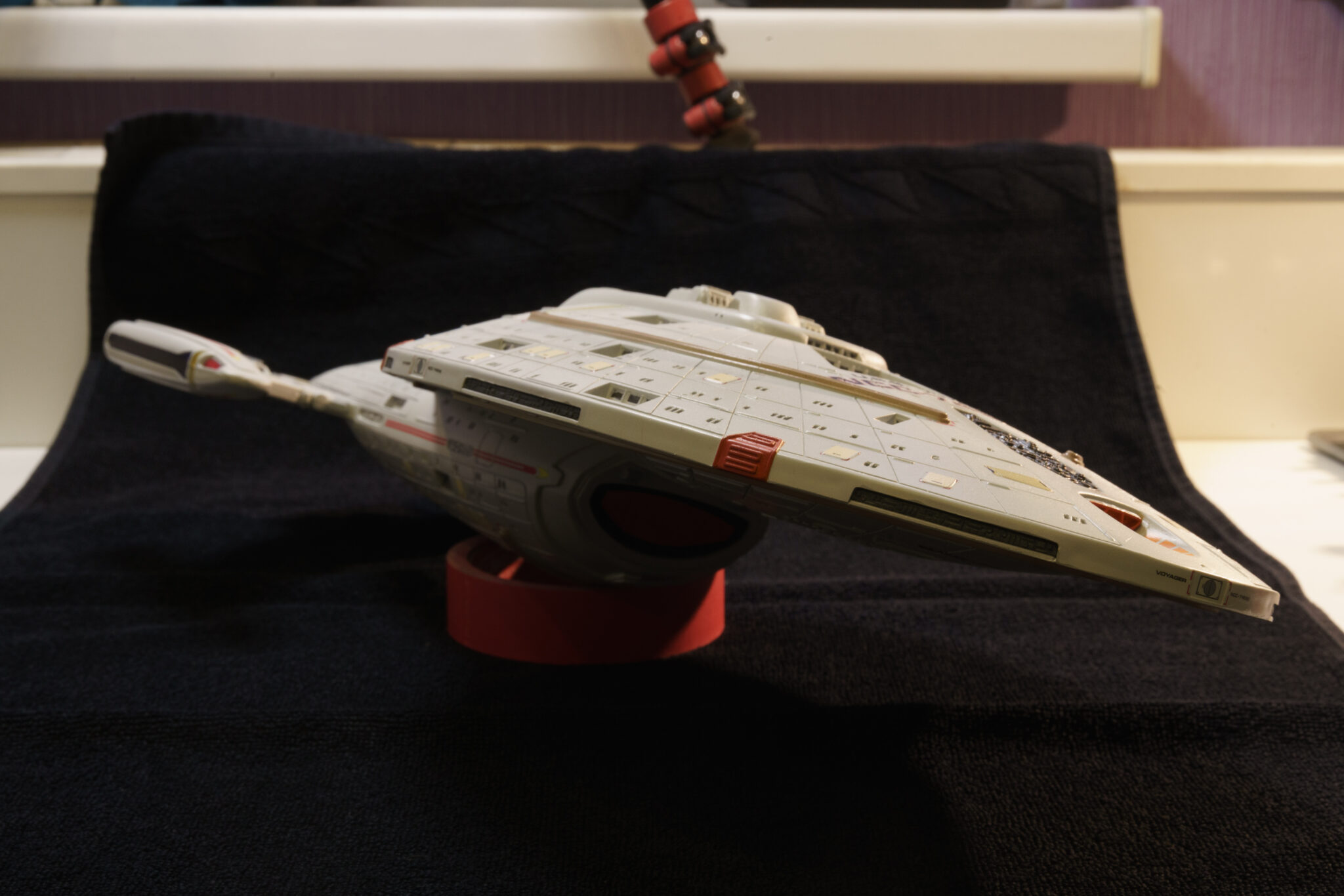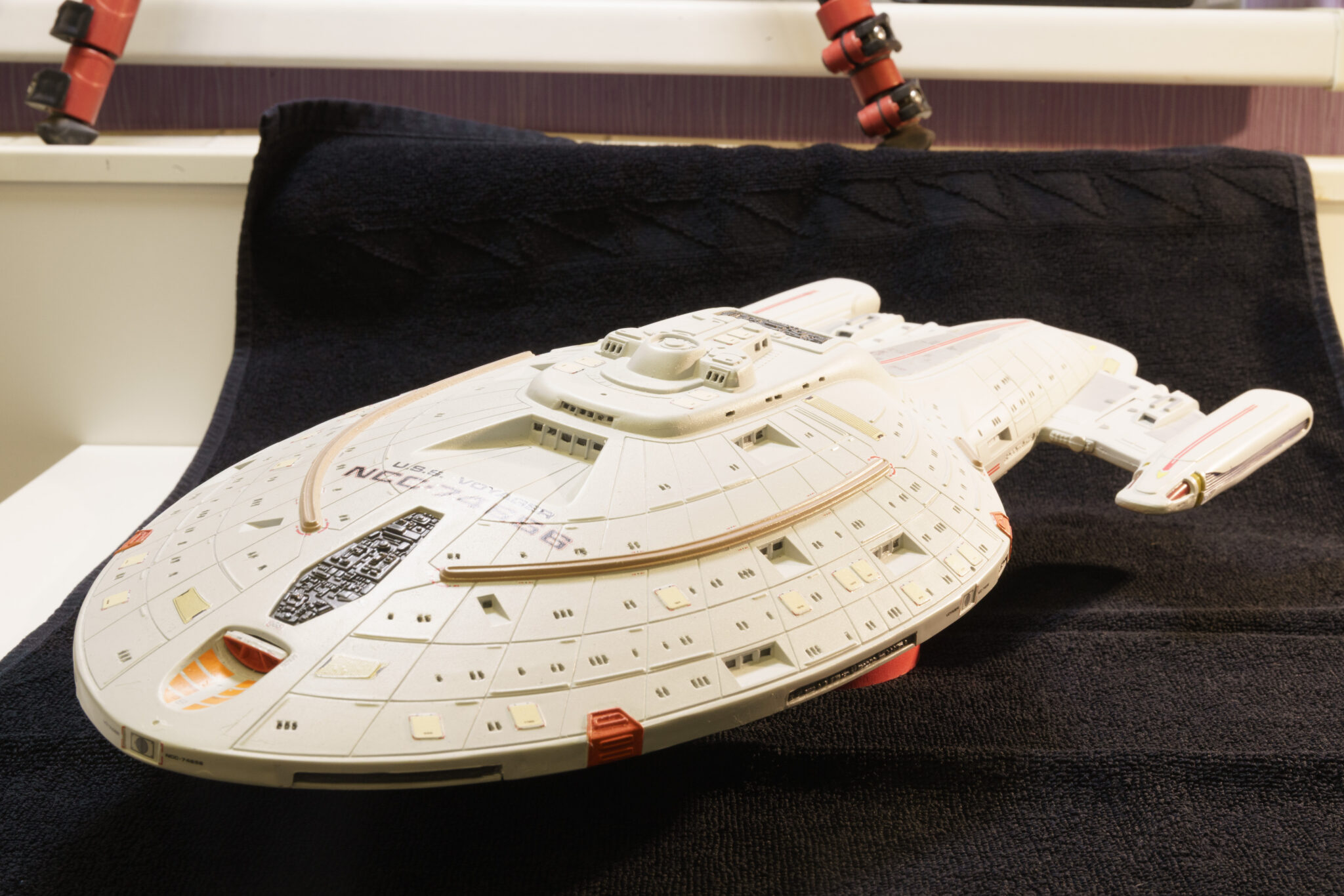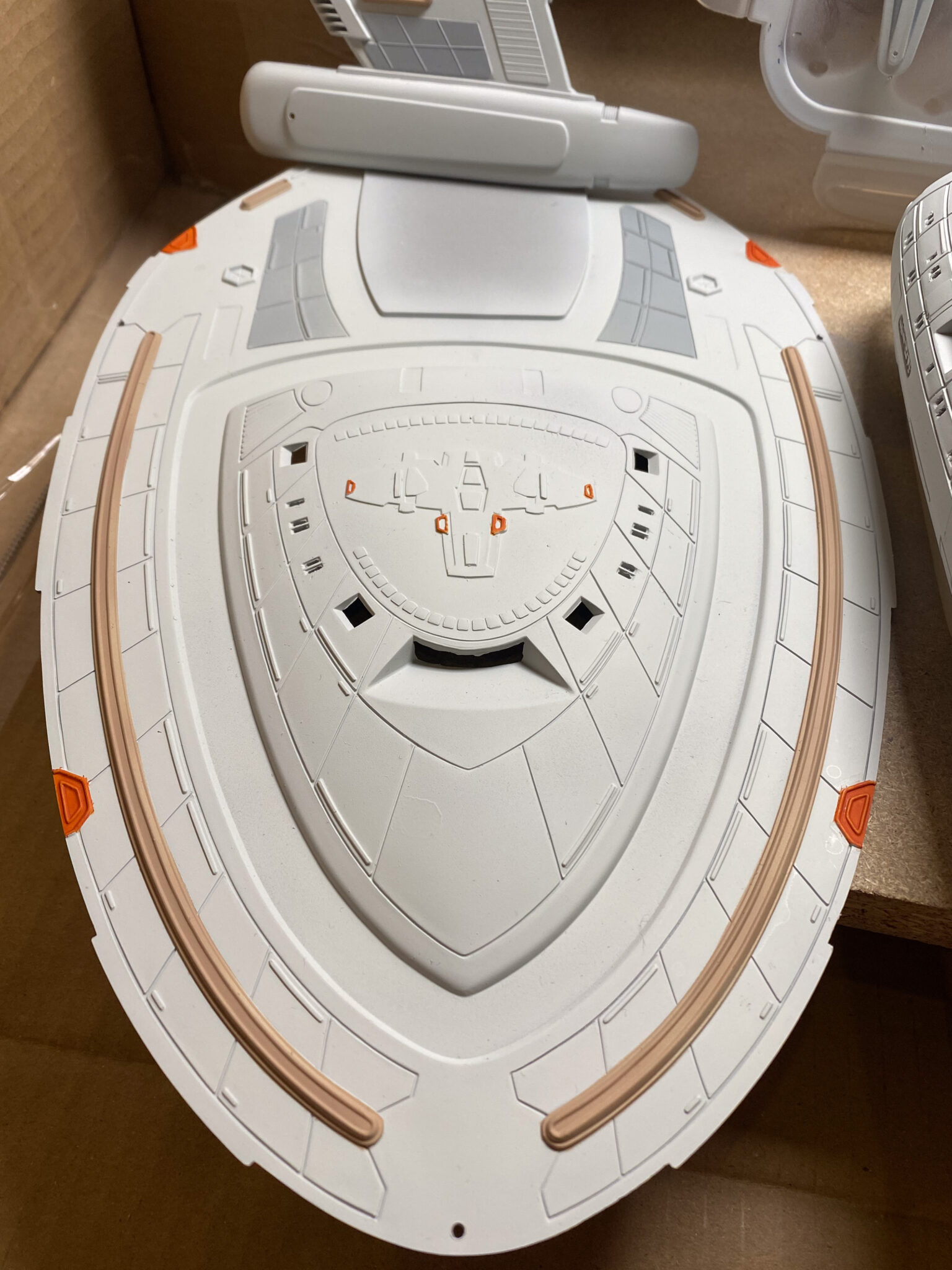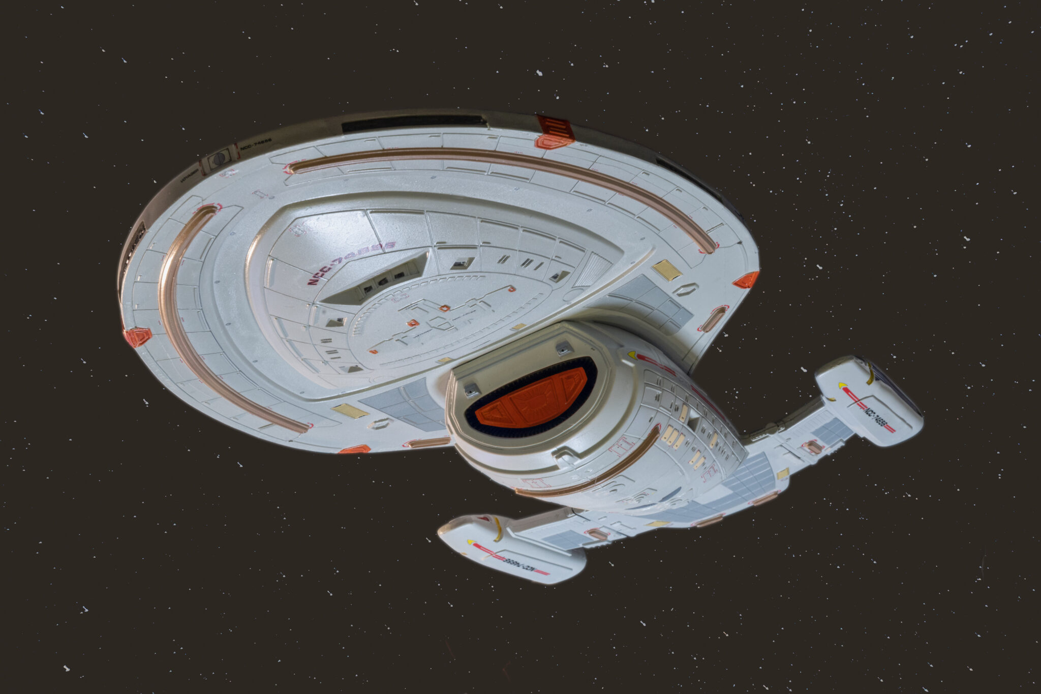 Wie bei vielen Modellbausätzen von Revell, gab es auch bei der U.S.S. Voyager einige Passungenauigkeiten. Insbesondere bei den schwenkbaren Pylonen und den Warpgondeln war ein hohes Maß an Präzision und Geduld erforderlich, um die Teile sauber zusammenzufügen. Hier halfen mir meine Erfahrung und ein wenig Kreativität: Mit Spachtelmasse und Schleifpapier konnte ich die Übergänge glätten und für eine nahtlose Optik sorgen. Diese Arbeitsschritte waren zwar zeitaufwendig, aber sie trugen wesentlich zum finalen Erscheinungsbild des Modells bei.
