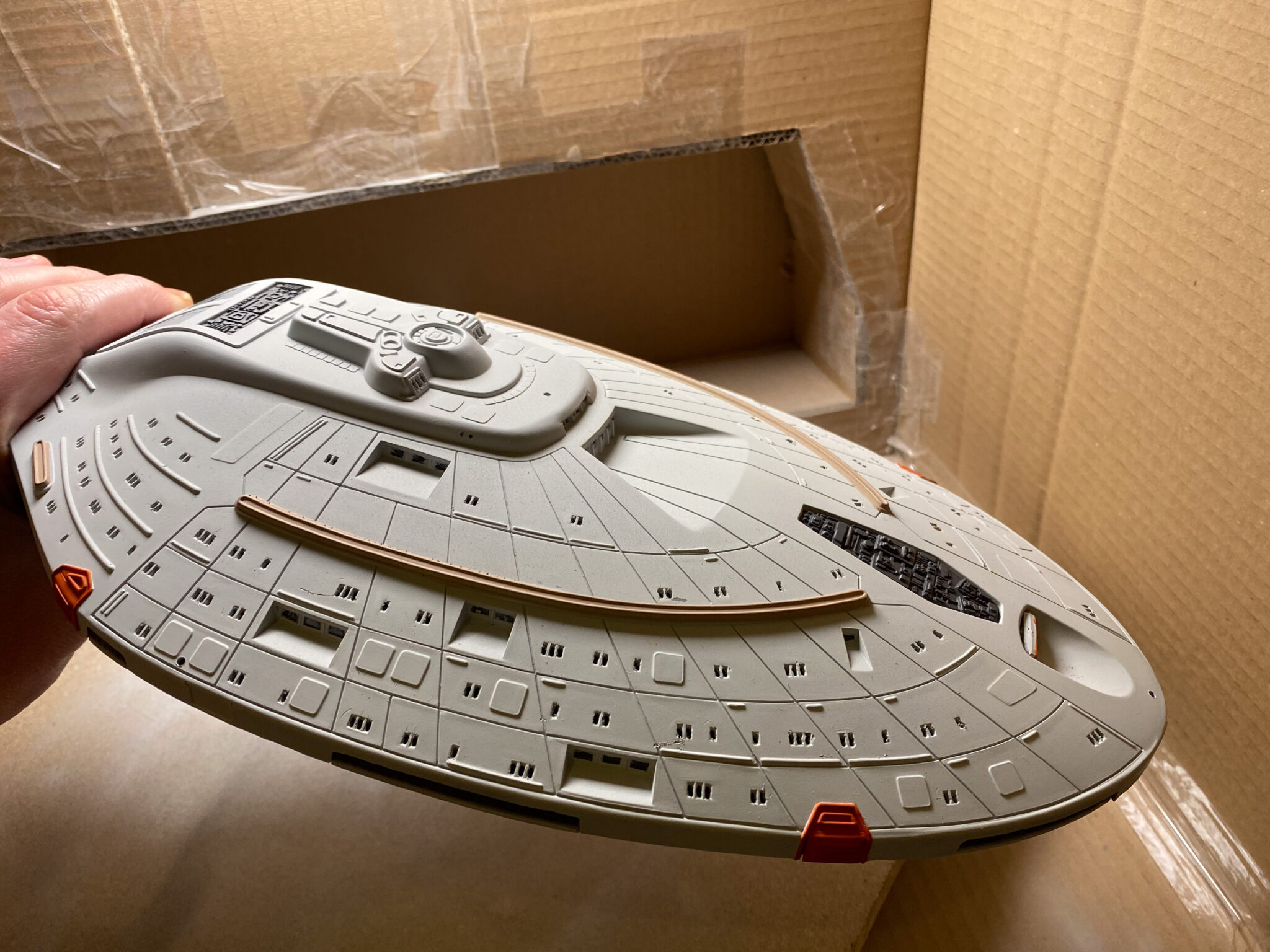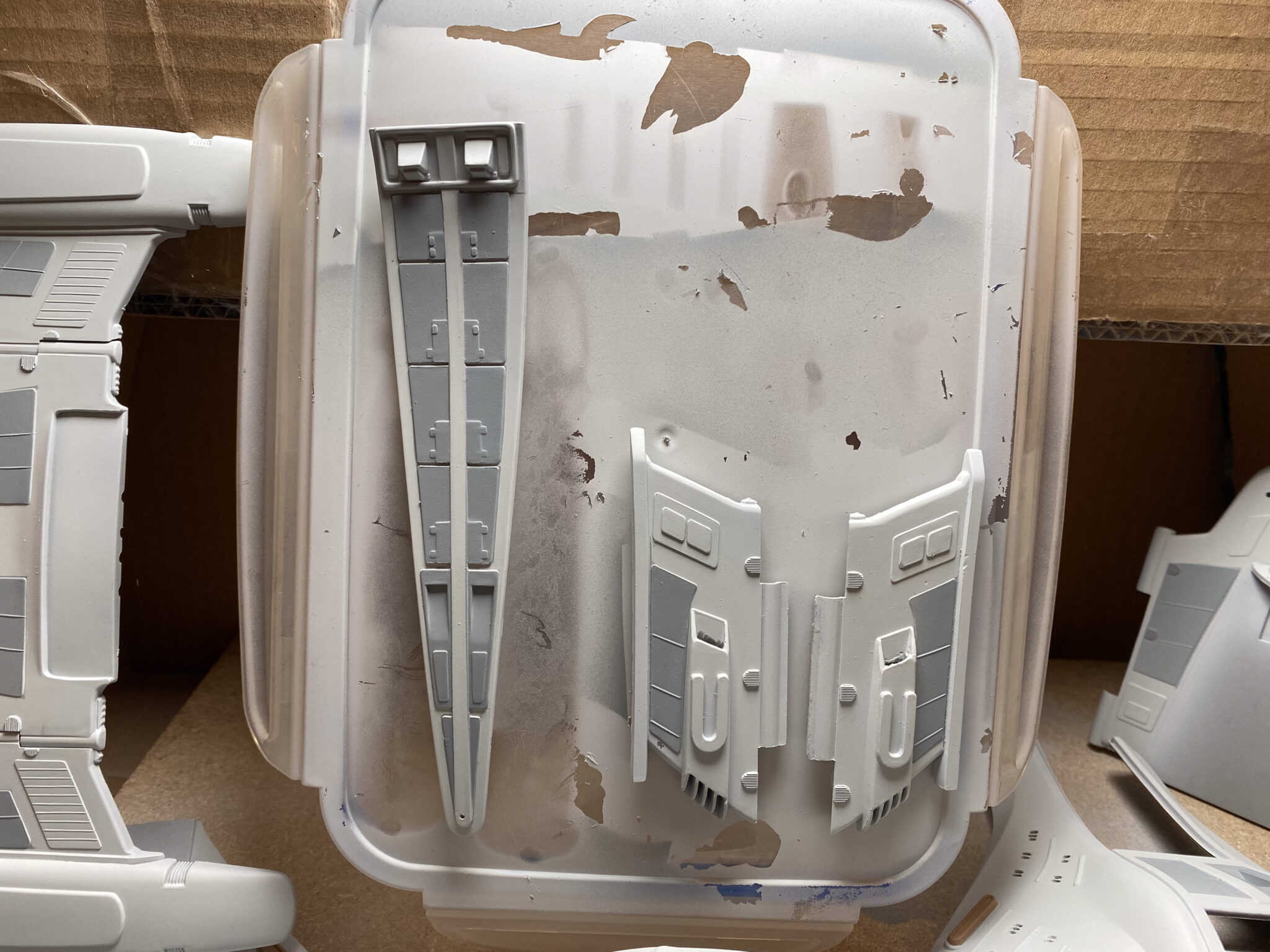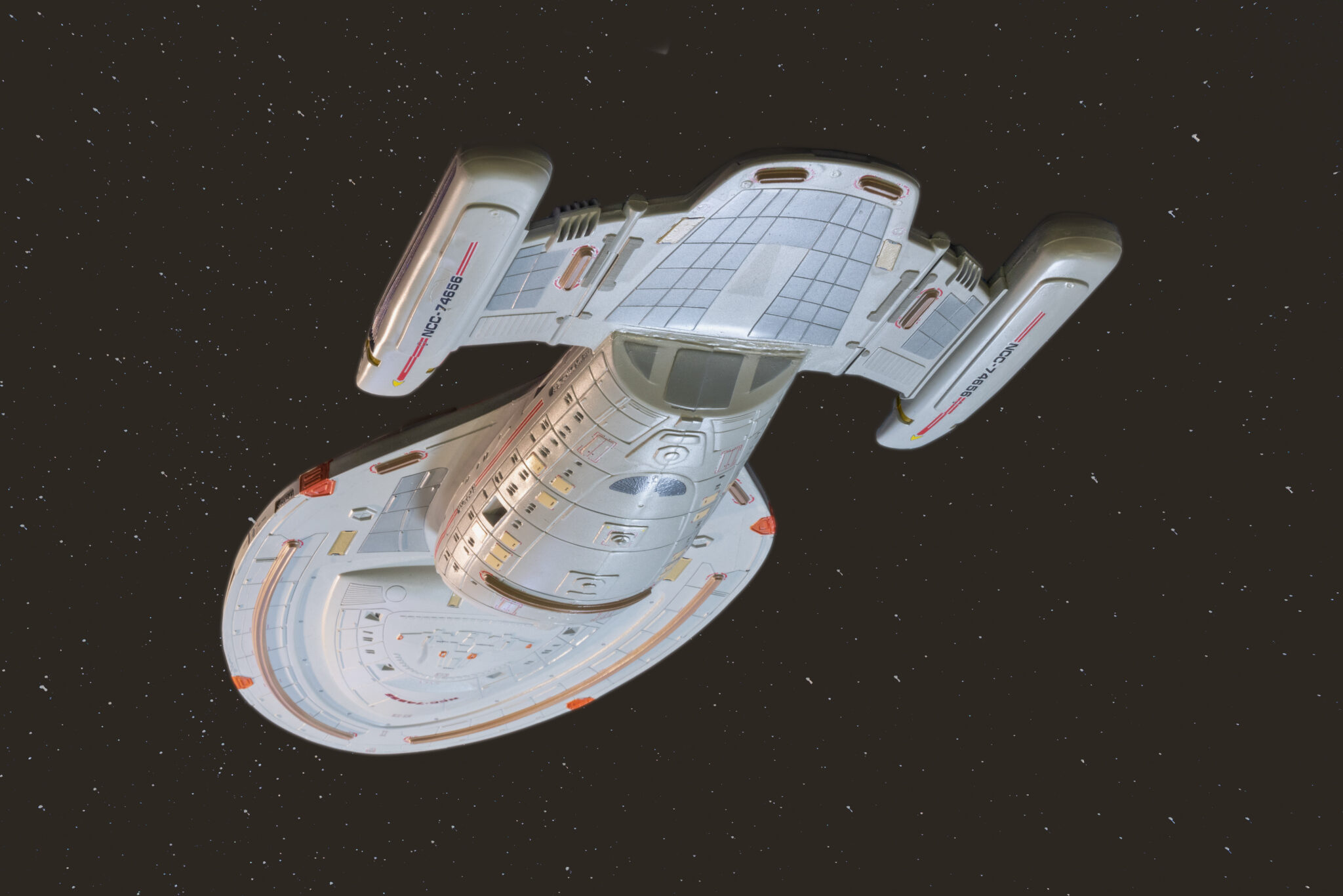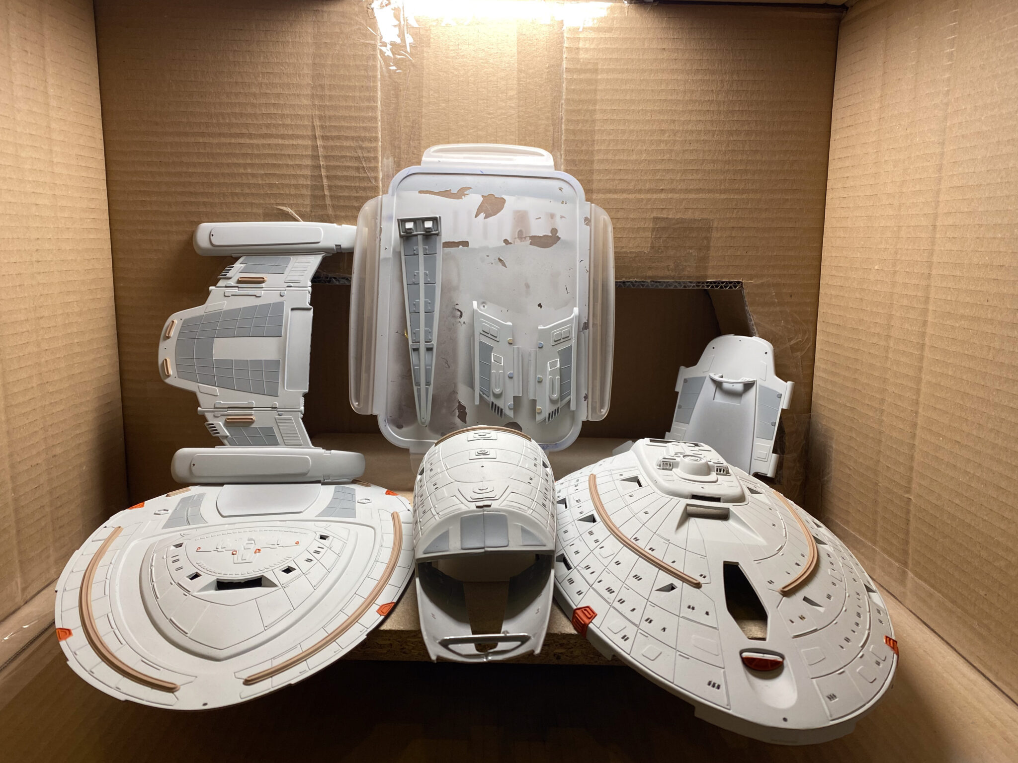 Wie bei vielen Modellbausätzen von Revell, gab es auch bei der U.S.S. Voyager einige Passungenauigkeiten. Insbesondere bei den schwenkbaren Pylonen und den Warpgondeln war ein hohes Maß an Präzision und Geduld erforderlich, um die Teile sauber zusammenzufügen. Hier halfen mir meine Erfahrung und ein wenig Kreativität: Mit Spachtelmasse und Schleifpapier konnte ich die Übergänge glätten und für eine nahtlose Optik sorgen. Diese Arbeitsschritte waren zwar zeitaufwendig, aber sie trugen wesentlich zum finalen Erscheinungsbild des Modells bei.