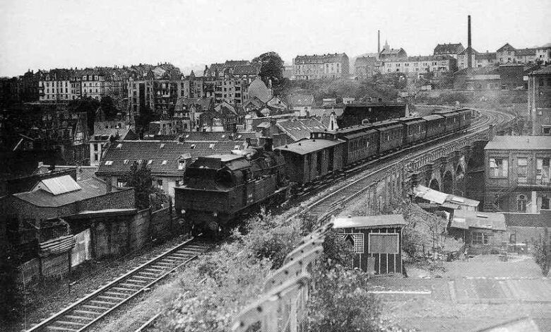 Das Foto zeigt das Wupperfelder Viadukt, aufgenommen von der Markusstraße aus, irgendwann Ende der 1950er Jahre. Der Fotograf dieses einzigartigen Dokuments ist leider unbekannt. Es handelt sich um ein bemerkenswertes Zeitzeugnis aus der unmittelbaren Nachkriegszeit im Grenzbereich von Wupperfeld und Wichlinghausen in Wuppertal.